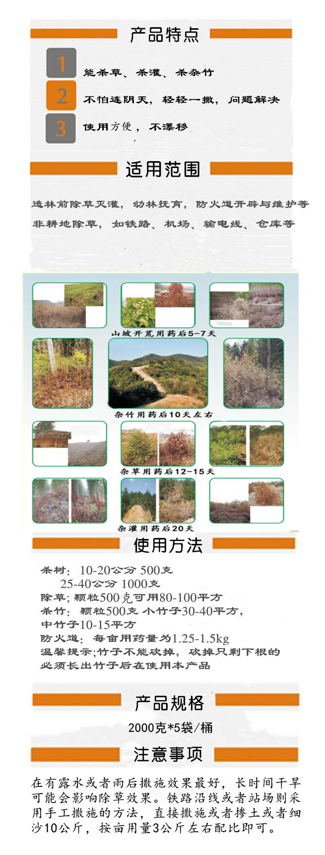 毒性:低毒;剂型:粉剂;适用作物:非耕地区域;包装清单:2000克*5袋/箱;