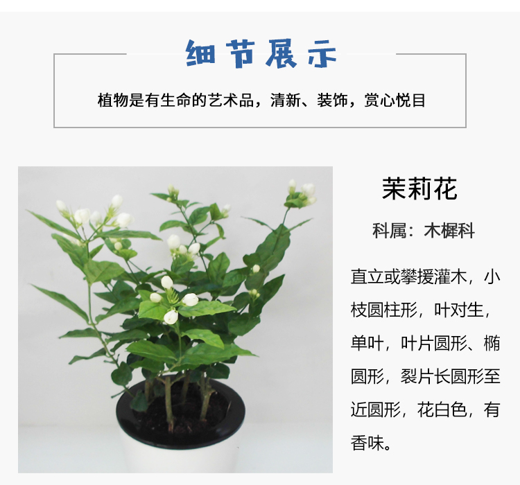 是否含花盆:含盆;植物品种:其它;植物类别:观叶植物;适用空间:阳台,书房,客厅,办公桌;包装清单:茉莉X1 盆X1;