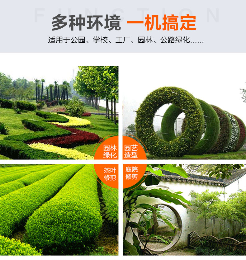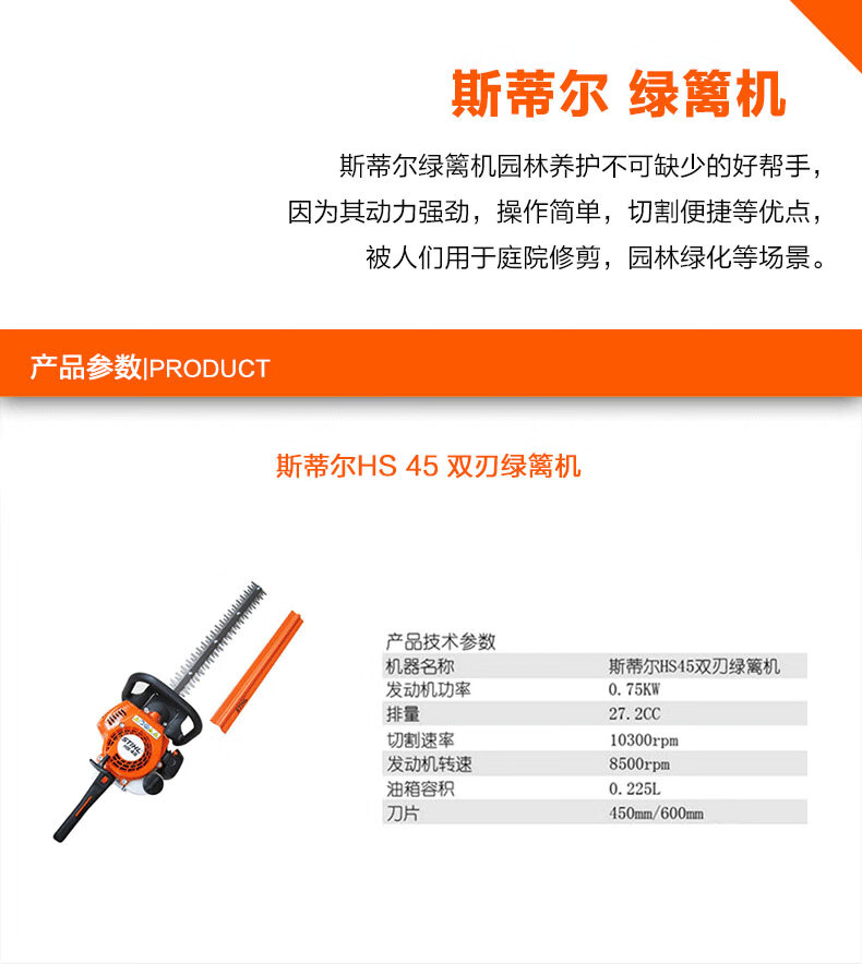 适用对象:路旁树篱;机械类型:绿篱修剪机;动力类型:二冲程;包装清单:裸机*1; 导板*1; 护套*1; 链条*1; 说明书*1;