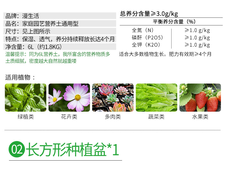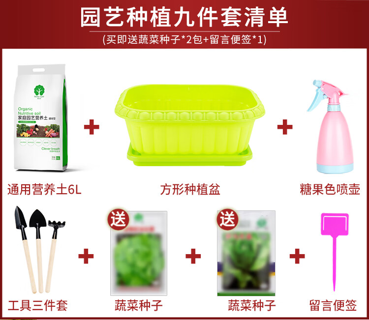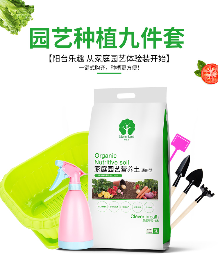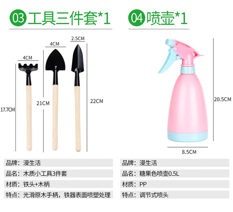 类型:泥炭;品牌:漫生活;包装清单:通用型营养土*1、种植盆(含托盘)*1、糖果喷水壶*1、园艺小工具3件套*1、留言夹*1、赠品*2;