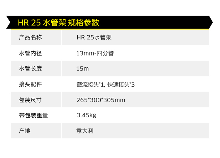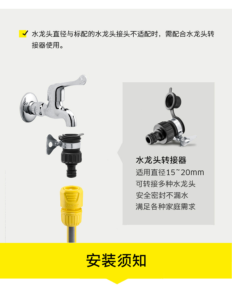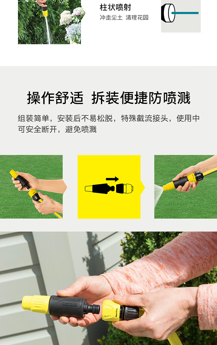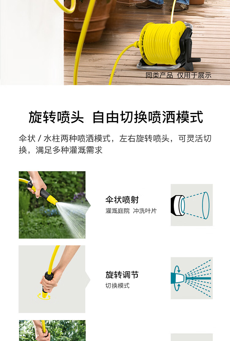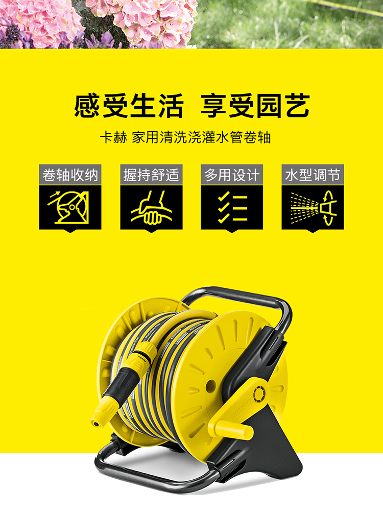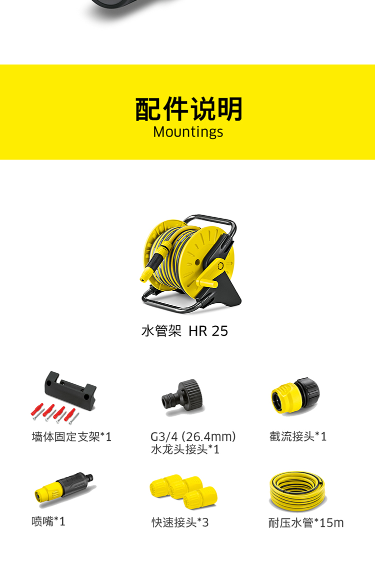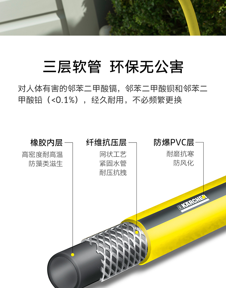 材质:树脂/PVC;国产/进口:进口;分类:水枪/水管/水管车;品牌:卡赫(KARCHER);包装清单:墙体固定支架*1 水龙头接头*1 截流接头*1 喷嘴*1 快速接头*3 耐压水管15m*1;