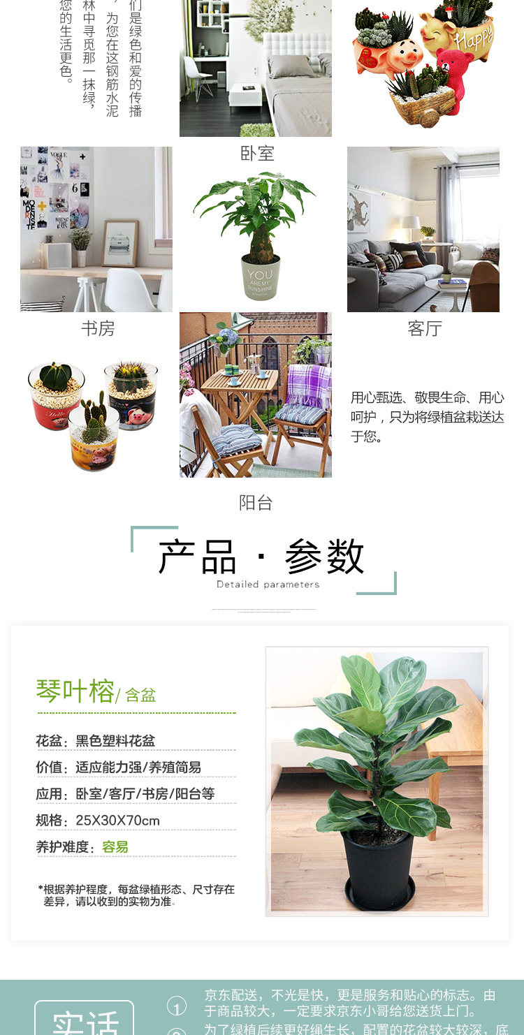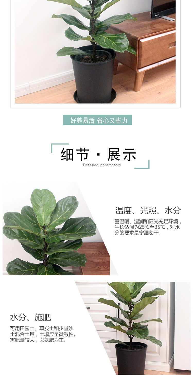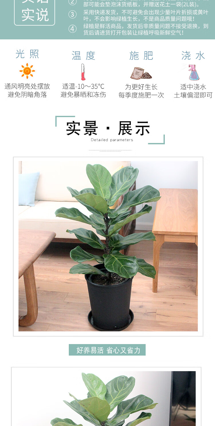 植物品种:琴叶榕;是否含花盆:含盆;整体高度:51cm-80cm;是否开花:否;适用空间:办公室,接待前台,书房,客厅;品牌:花七休;包装清单:大琴叶榕×1、加厚黑色塑料花盆×1、黑色塑料托盘、包装箱×1;