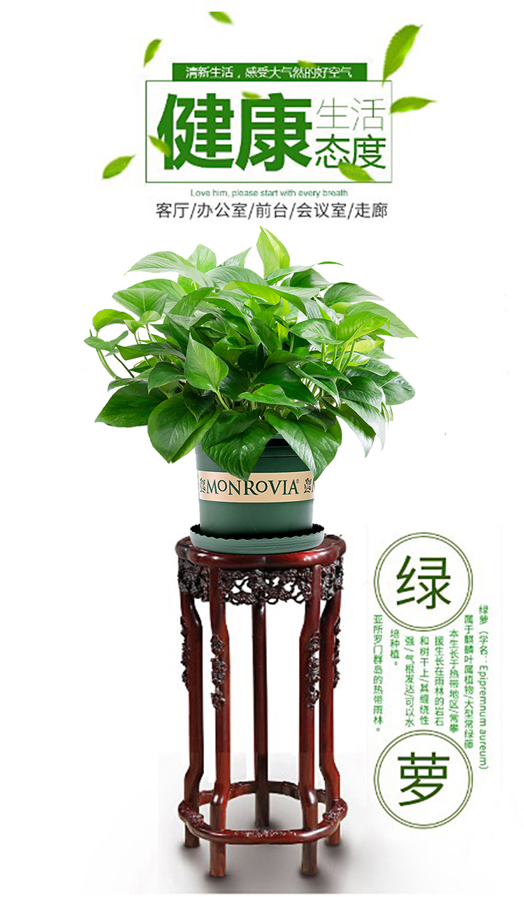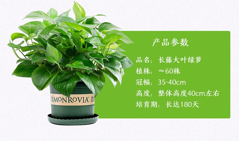 植物品种:绿萝;是否含花盆:含盆;植物类别:观叶植物;适用空间:客厅,办公桌,卧室,书房;包装清单:加仑盆绿萝2盆;