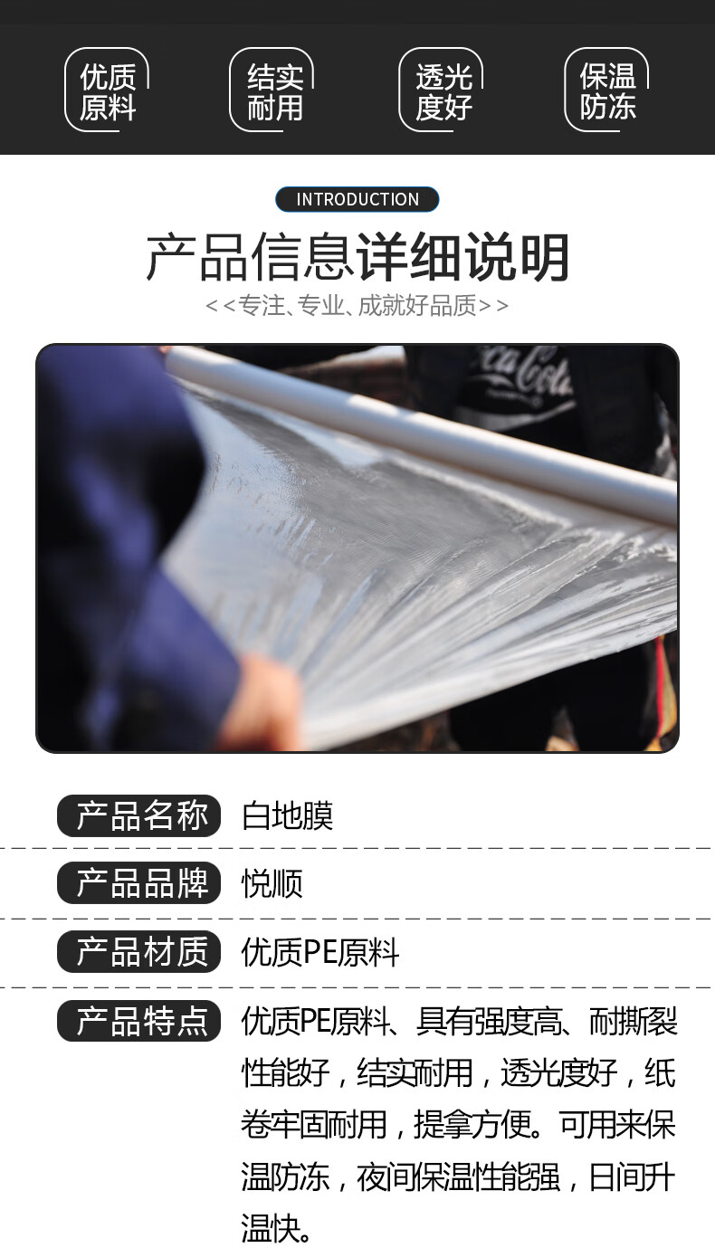 用途:地膜;透光性:透明薄膜;品牌:悦顺;包装清单:农用白地膜1.2米宽1丝厚约330米长净重8斤/卷;