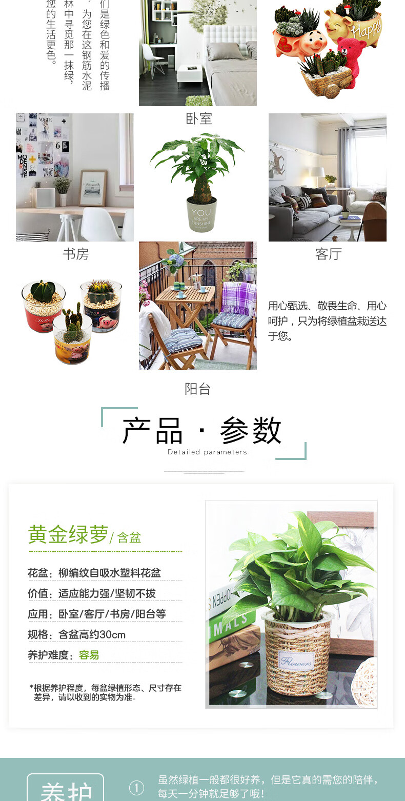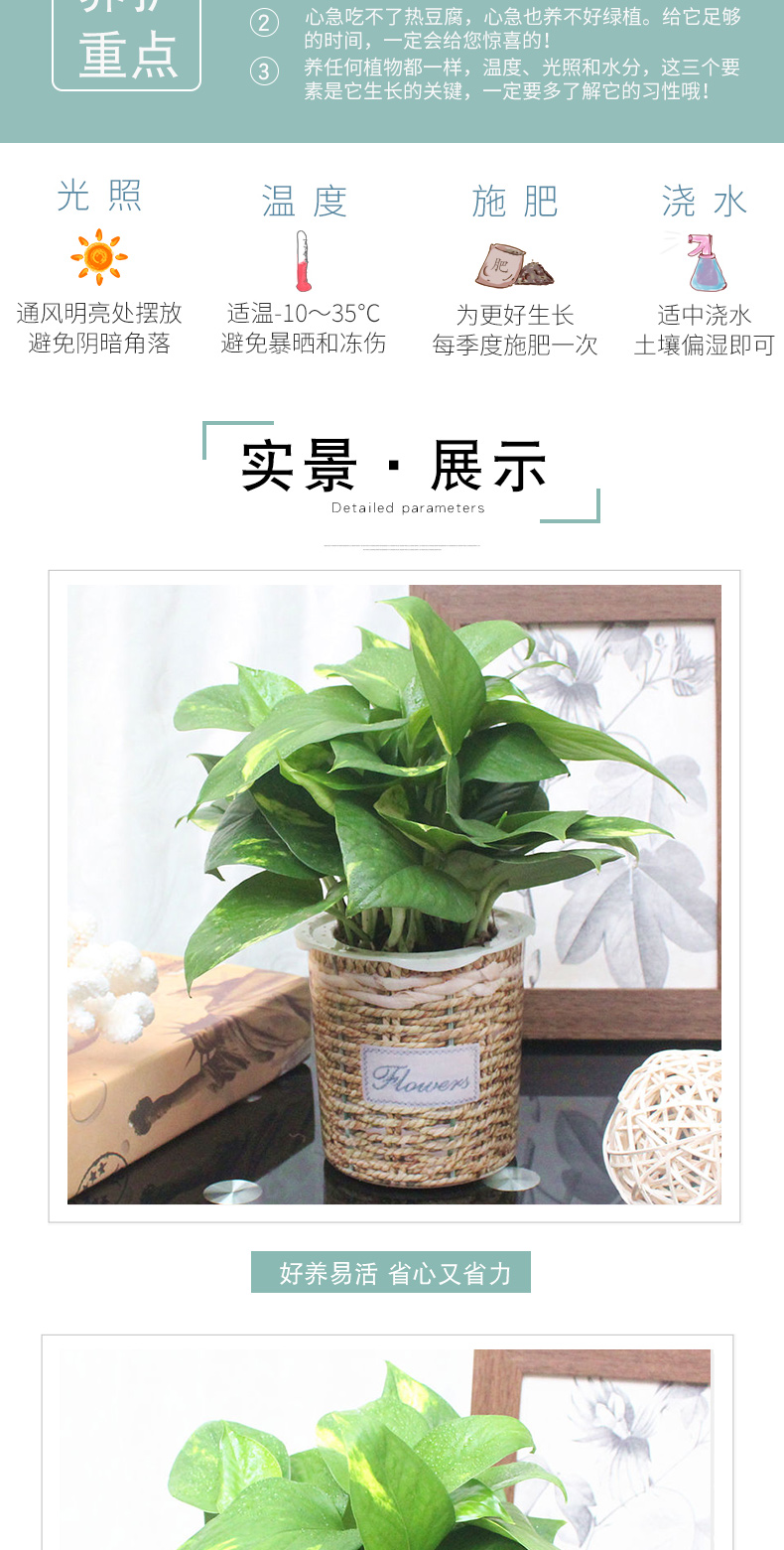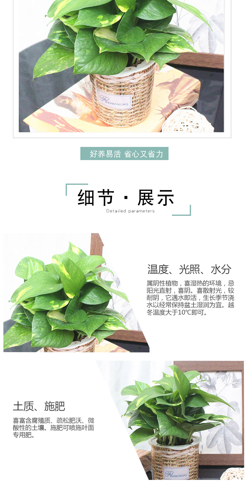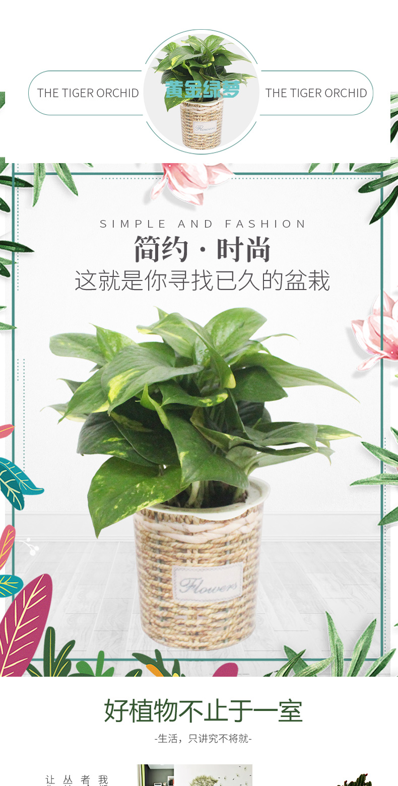 植物品种:绿萝;是否含花盆:带盆栽好;植物类别:观叶植物;适用空间:阳台,客厅,办公桌,书房;包装清单:黄金绿萝X1、柳编纹自吸水塑料花盆X1、包装箱X1。;