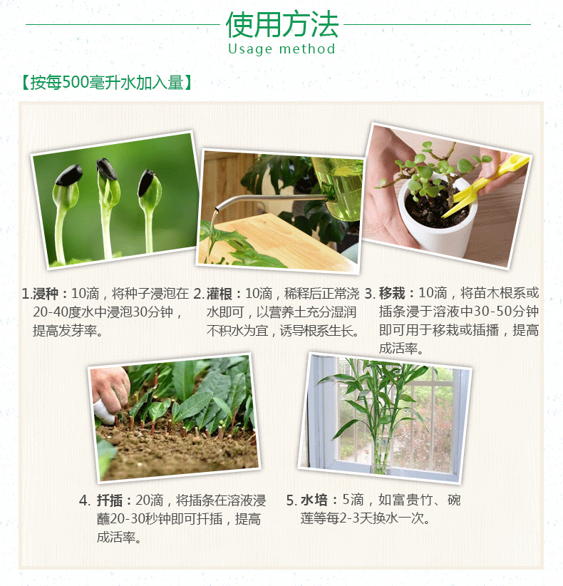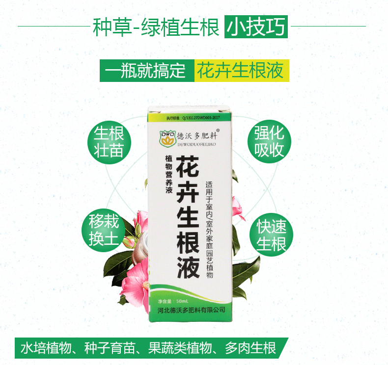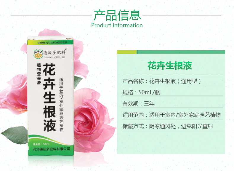 性状:液体;营养类型:营养液;适用对象:多肉植物,兰科植物,通用型,水培型,蔬菜水果,观花植物,观叶植物,苗木,盆景,其它;品牌:德沃多肥料;包装清单:德沃多生根液50ml*2瓶;