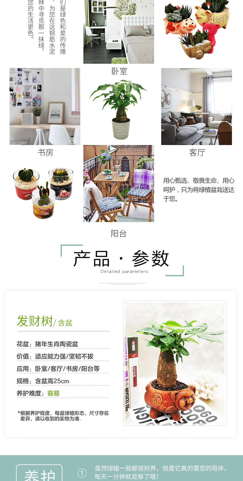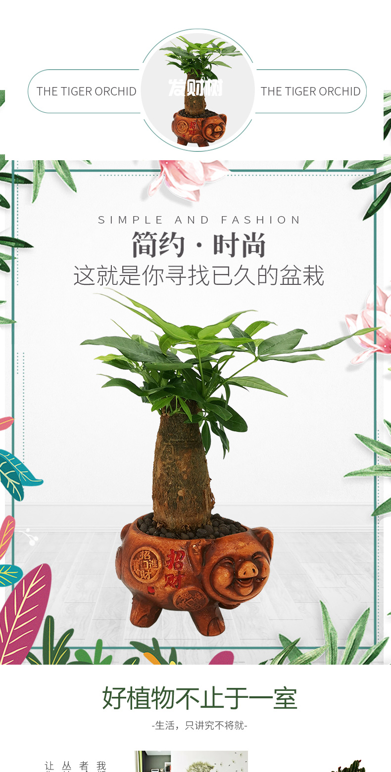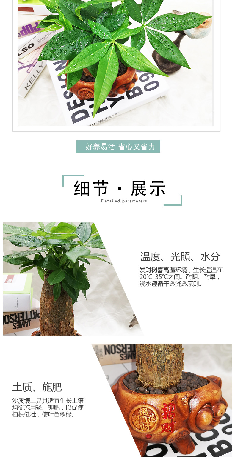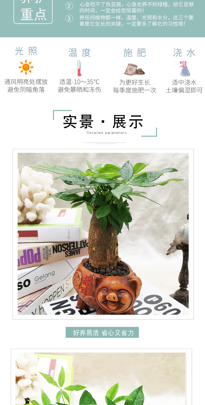 植物品种:发财树;是否含花盆:带盆栽好;植物类别:观叶植物;适用空间:阳台,客厅,办公桌,书房;包装清单:发财树X1,猪年纪念款陶瓷花盆X1、包装箱X1;