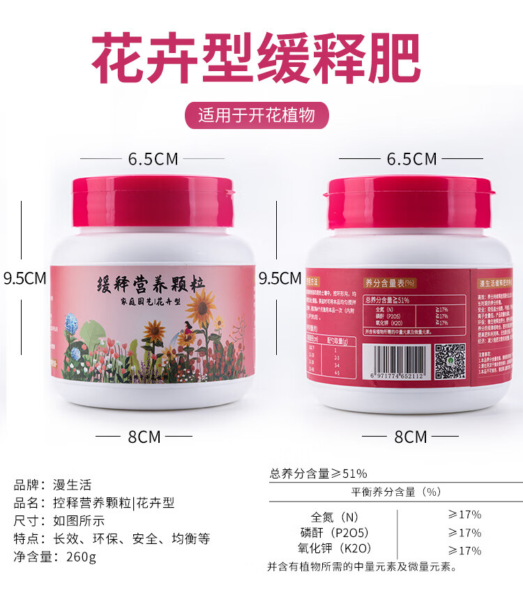 性状:固体;营养类型:缓释肥;品牌:漫生活;包装清单:花卉型缓释营养粒260g/瓶;