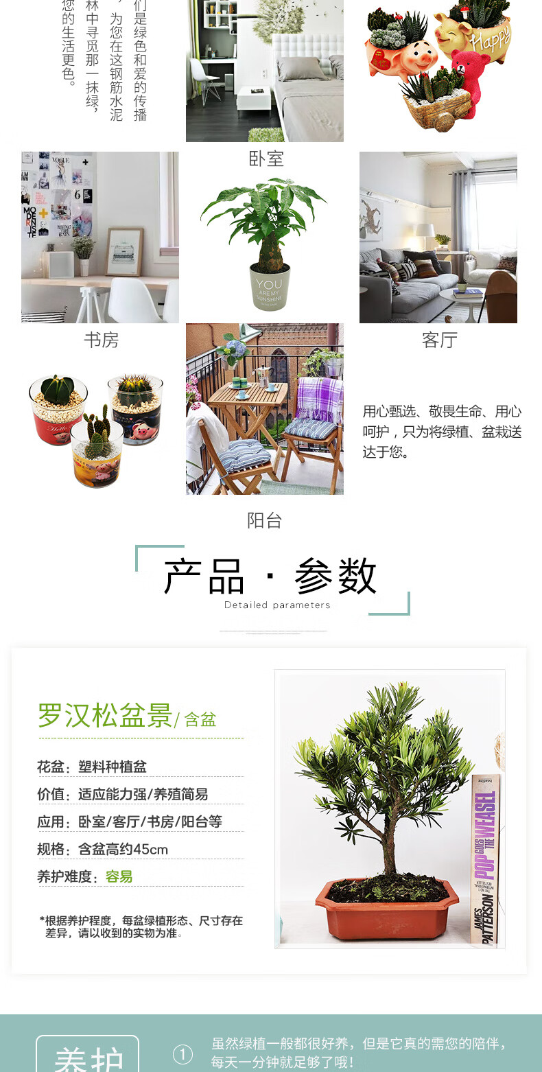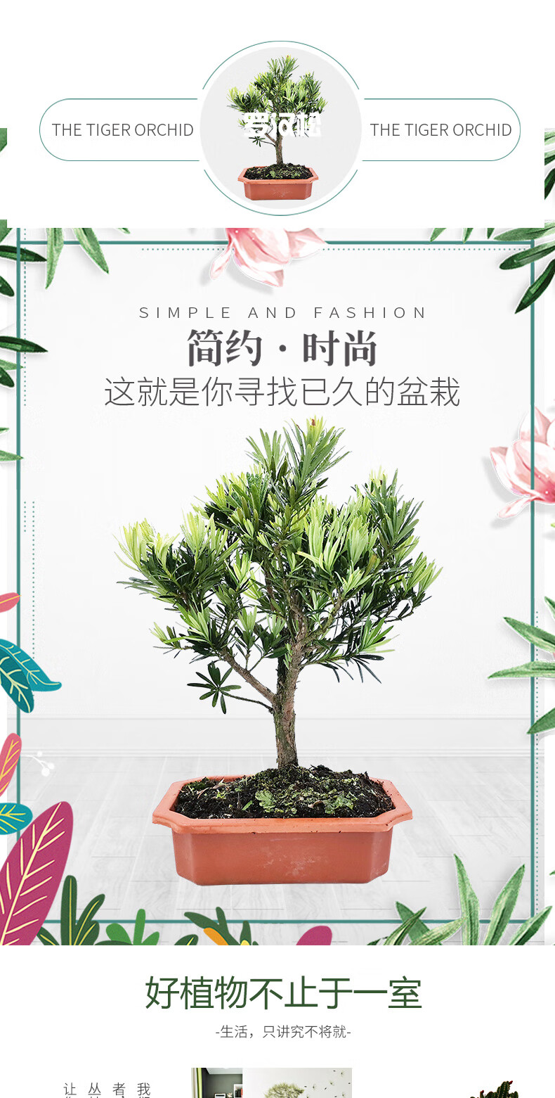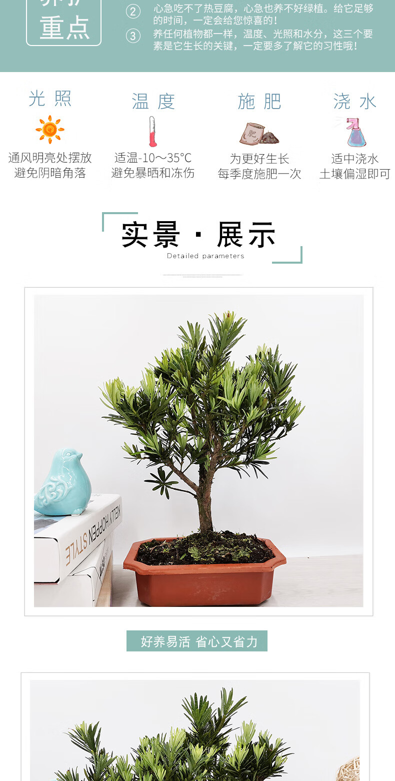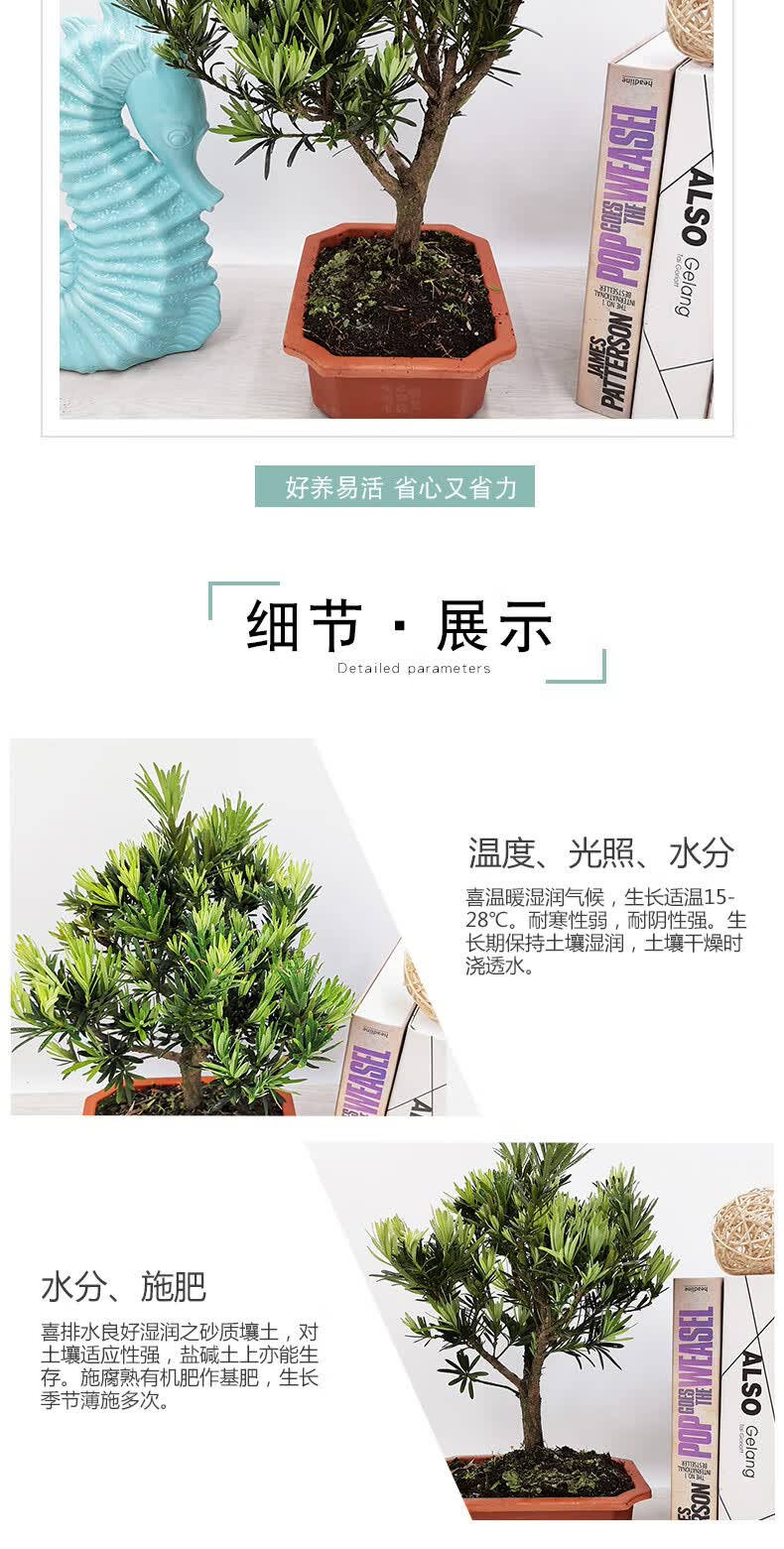 植物品种:罗汉松;是否含花盆:带盆栽好;植物类别:观茎植物;适用空间:阳台,客厅,办公桌,书房;包装清单:罗汉松盆景X1、塑料种植花盆X1、包装箱X1。;