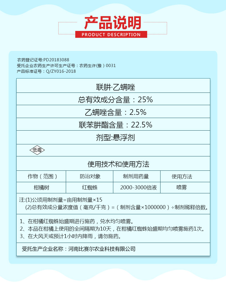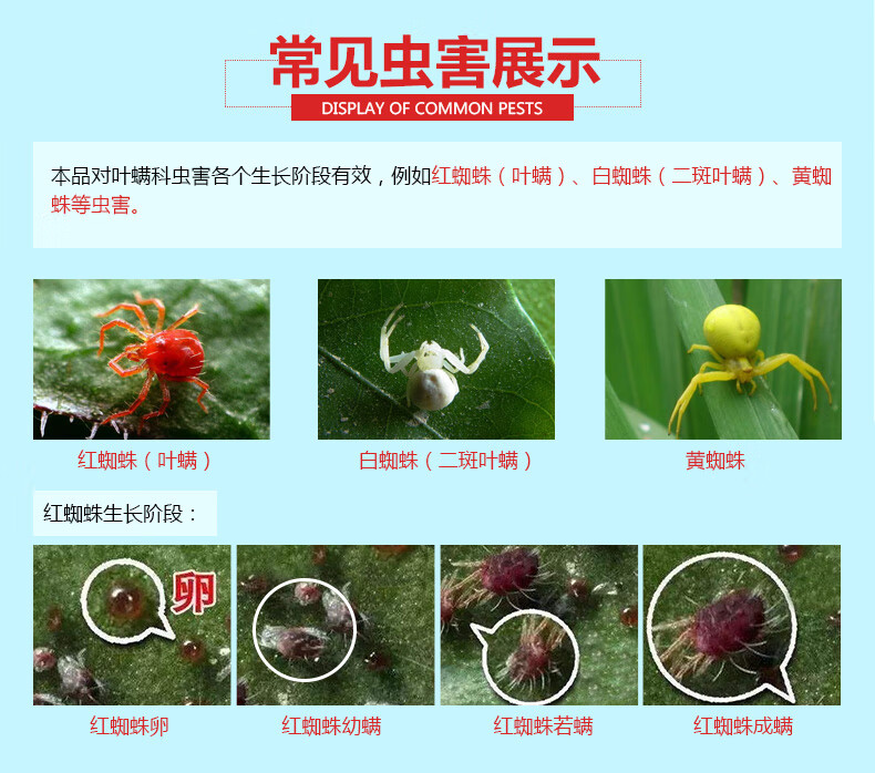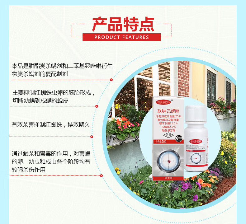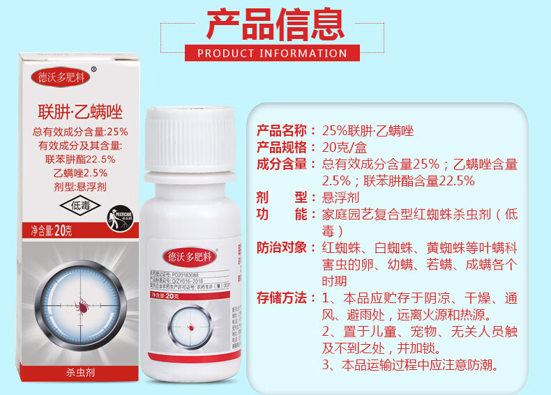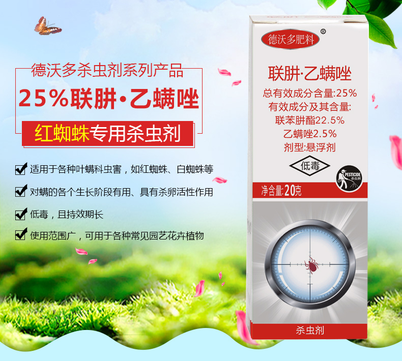 药剂种类:杀虫剂;功效:杀虫;性状:液体;品牌:德沃多肥料;包装清单:德沃多联肼乙螨唑20g;