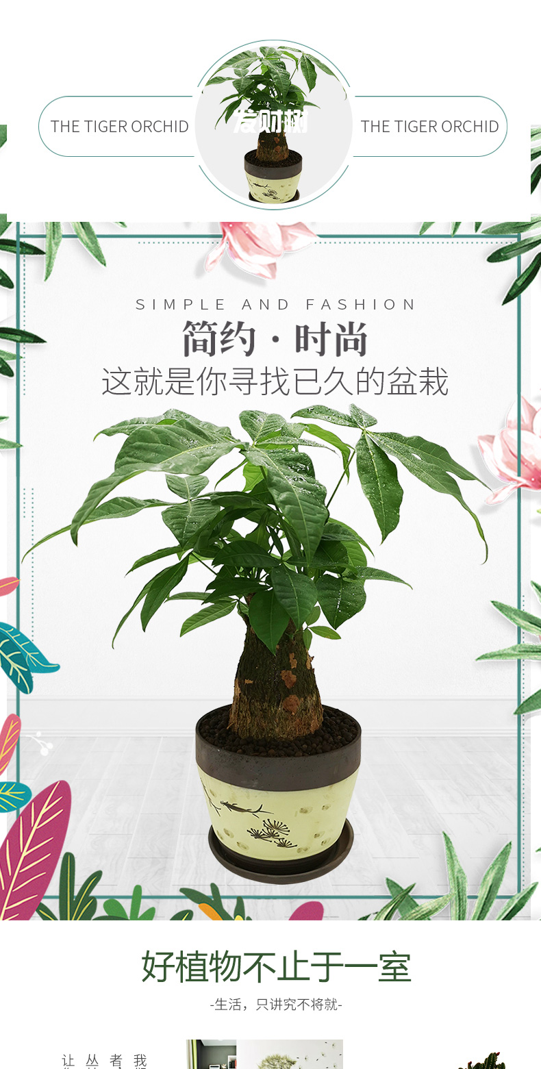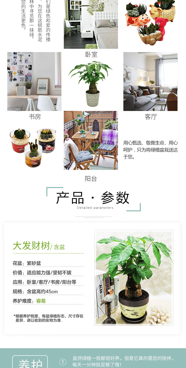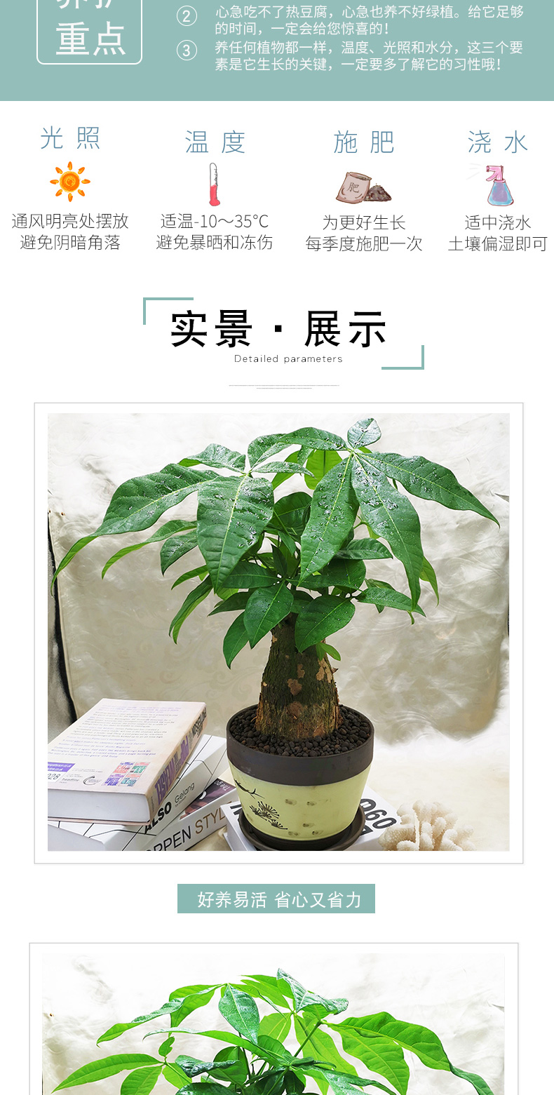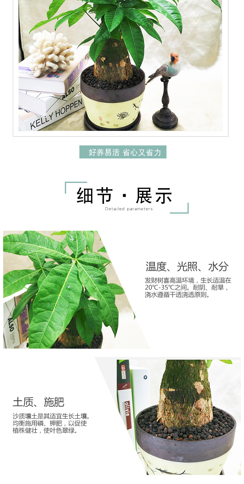 植物品种:发财树;是否含花盆:带盆栽好;植物类别:观叶植物;适用空间:阳台,客厅,办公桌,书房;包装清单:大发财树X1、紫砂陶瓷花盆X1、包装箱X1。;
