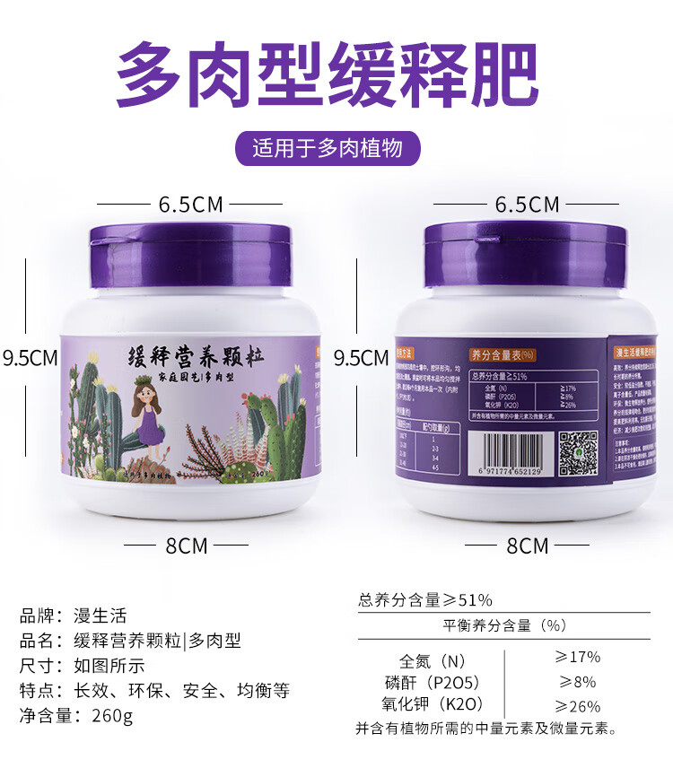 性状:固体;营养类型:缓释肥;品牌:漫生活;包装清单:多肉型缓释肥营养颗粒260g/瓶;
