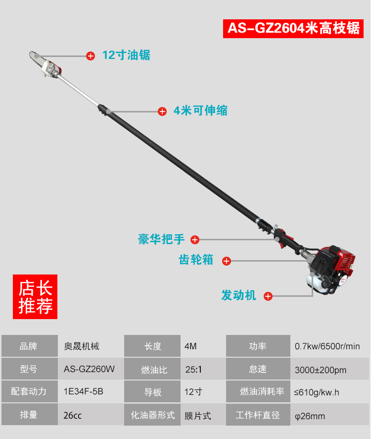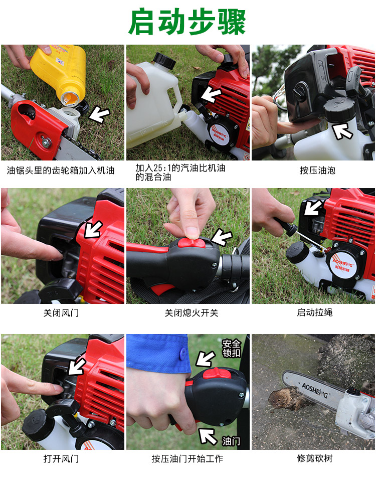 适用对象:树木;机械类型:油锯;动力类型:二冲程;包装清单:油锯头总成*1 导板*1 链条*1 内六角三组合*1 配比壶*1 背带*1 十字双头套筒*1 内六角扳手*1 内六角扳手*1 呆扳手*1 双向螺丝刀*1 中文说明书*1 合格证*1 三包凭证*1;