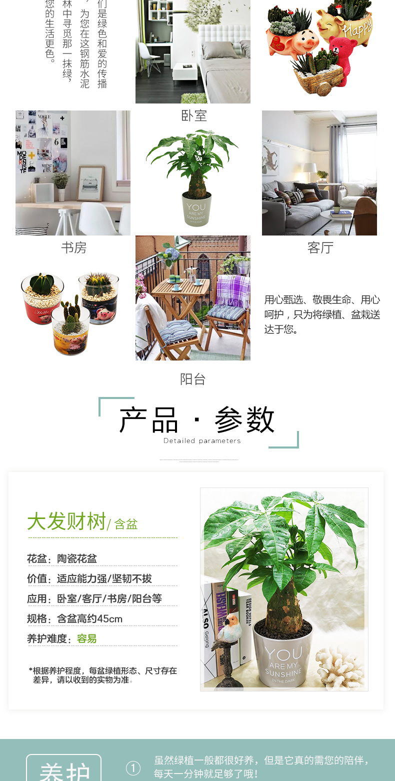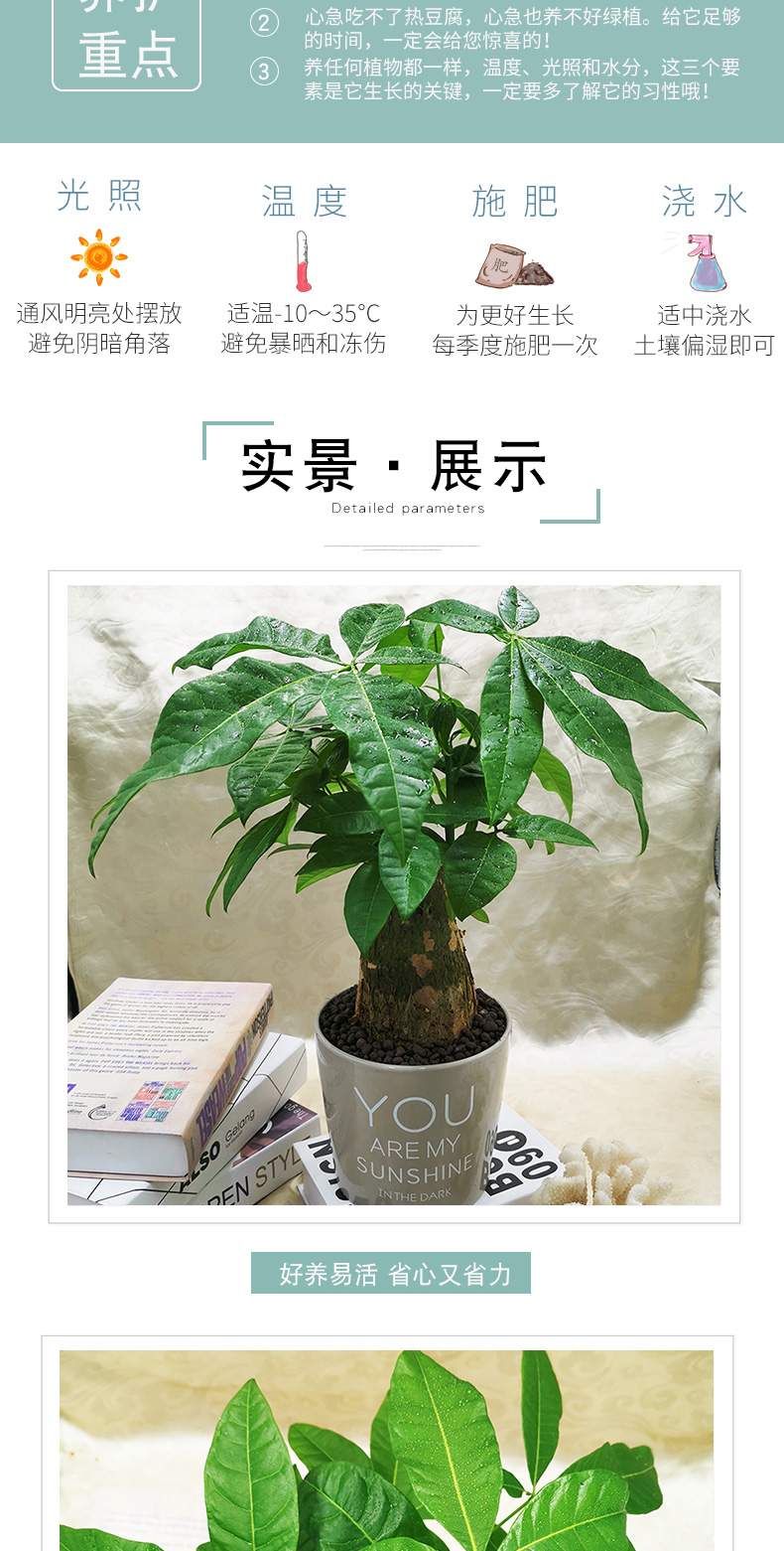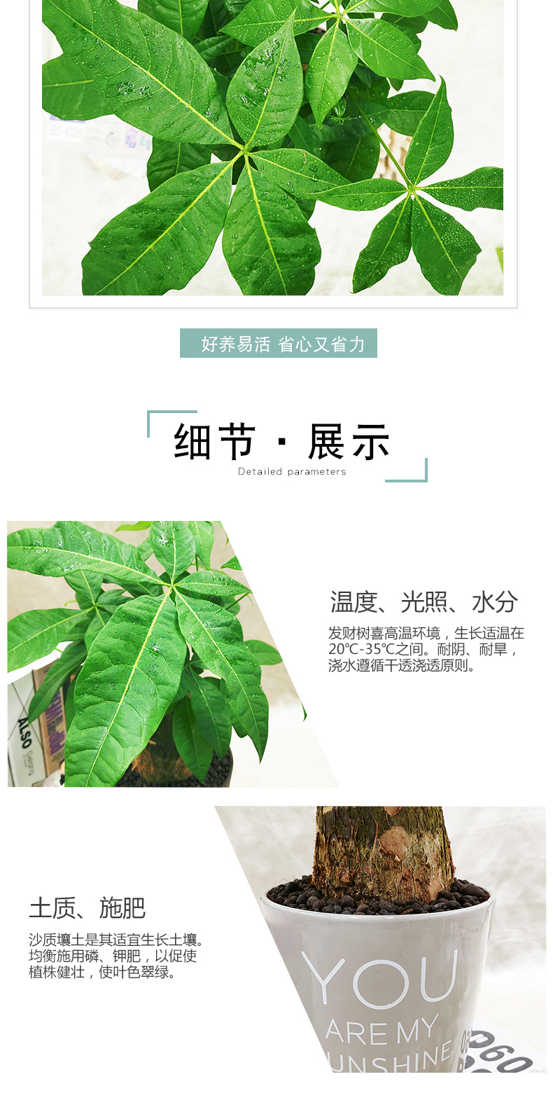 植物品种:发财树;是否含花盆:带盆栽好;植物类别:观叶植物;适用空间:阳台,客厅,办公桌,书房;包装清单:大发财树X1、陶瓷花盆X1、包装箱X1。;