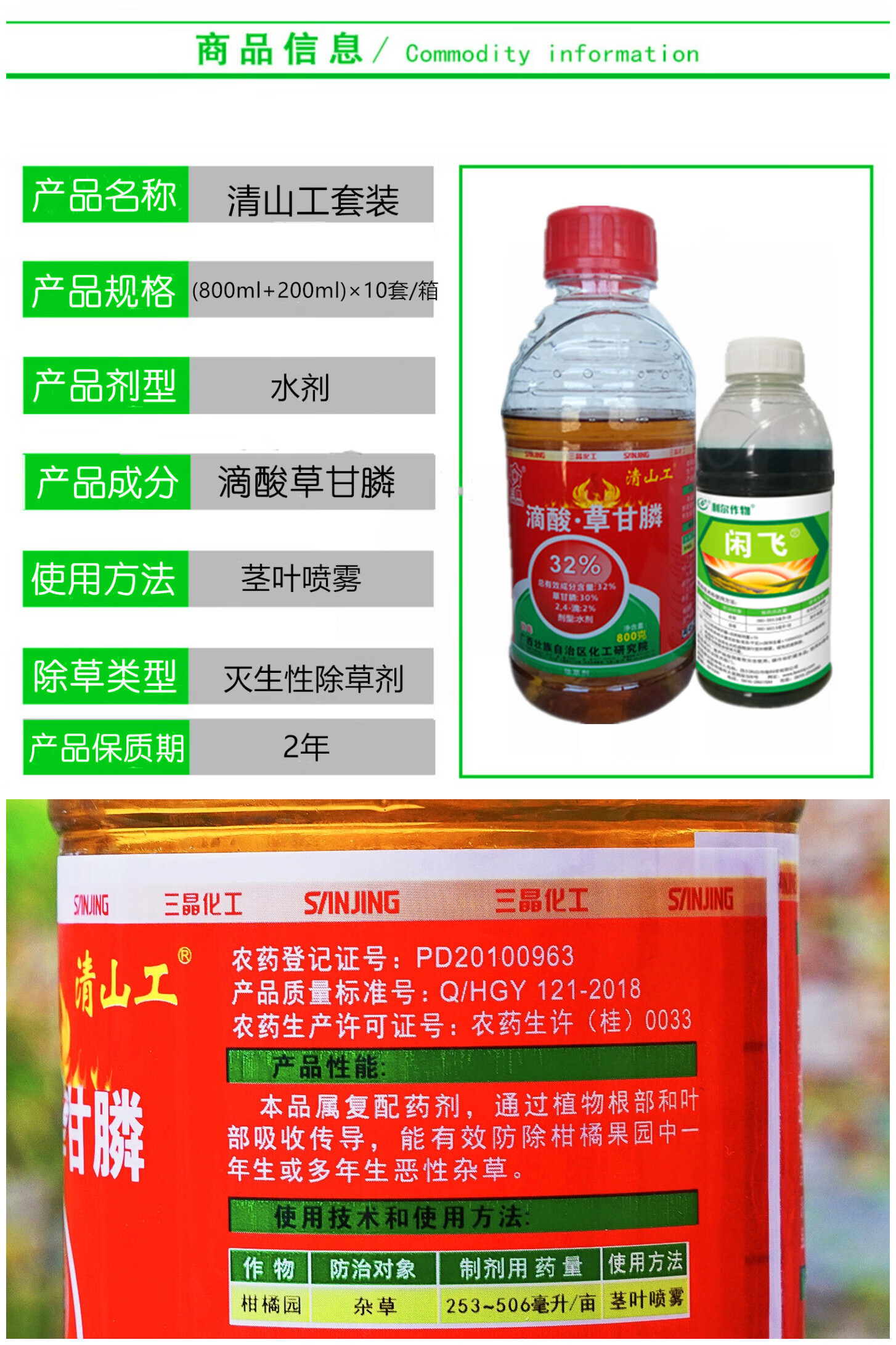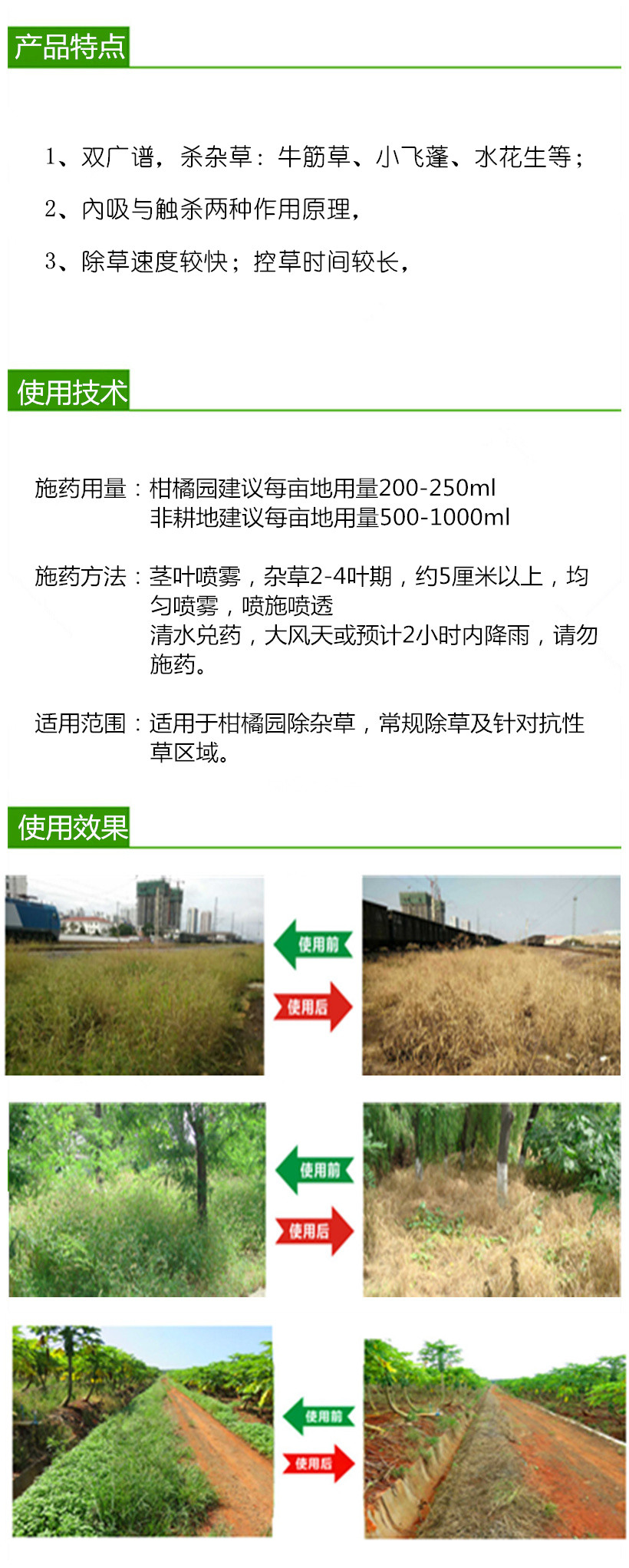 毒性:低毒;剂型:微/水乳剂;适用作物:园林绿化,果树,非耕地区域;包装清单:(800ml滴酸草+200ml草铵膦)×10套/箱 10公斤/箱;