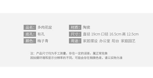 尺寸:16-20cm;材质:陶瓷;适用空间:桌面,地面;底部留孔:有孔;品牌:晨色;包装清单:花盆*1;