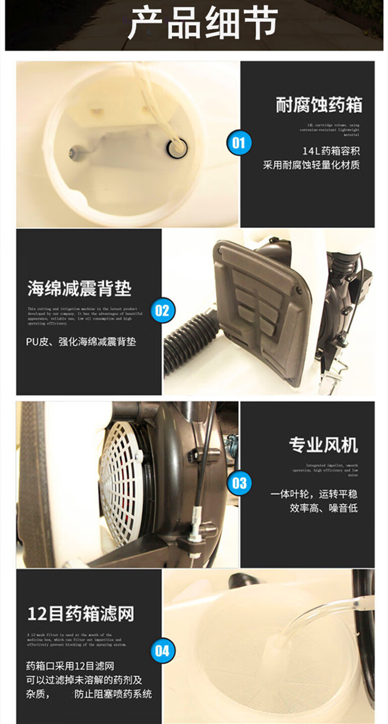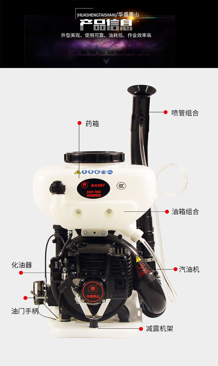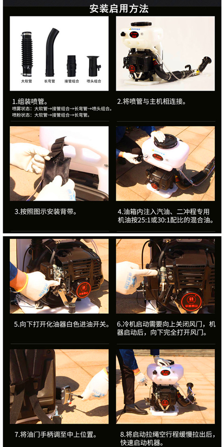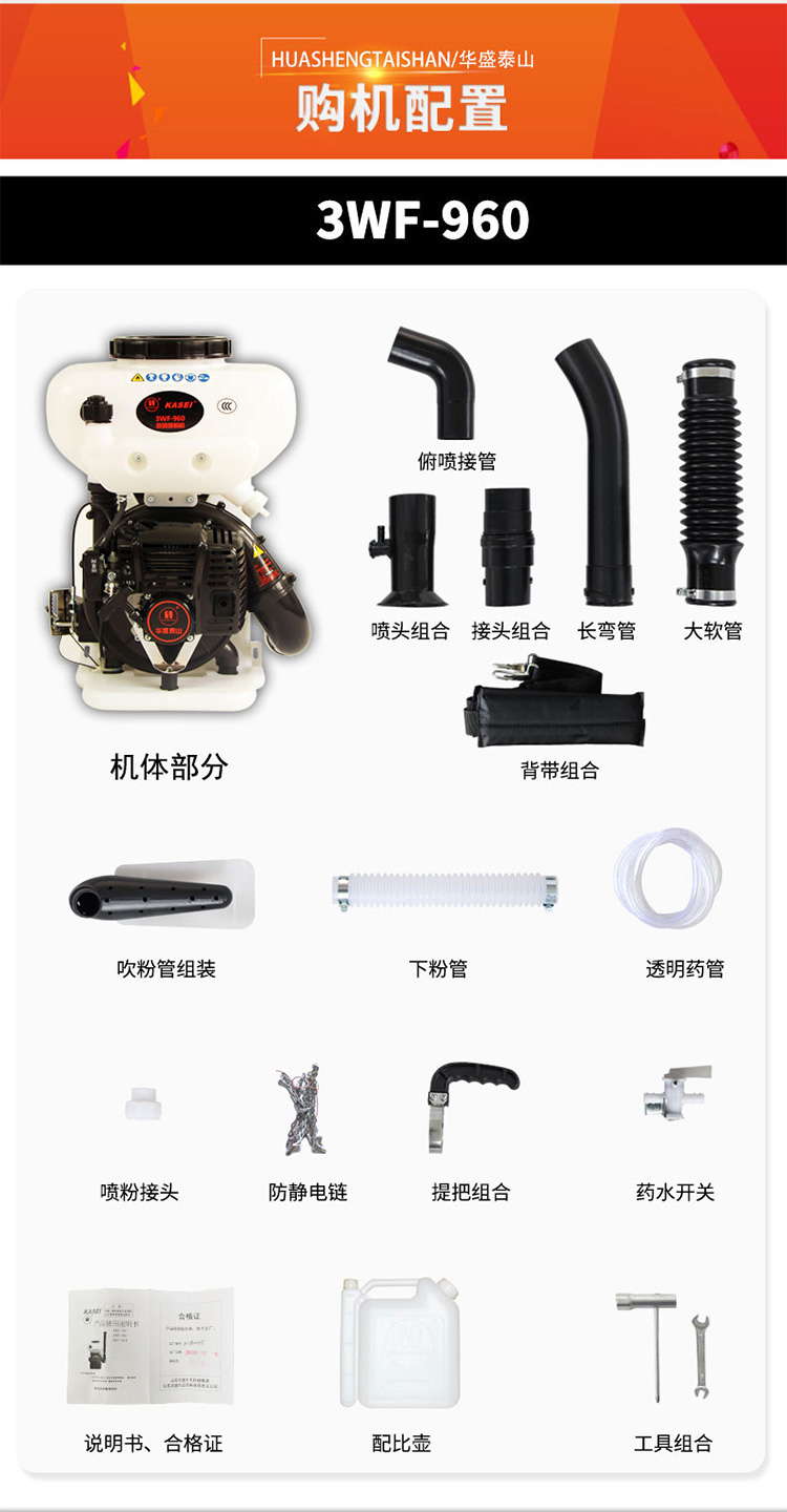 分类:喷雾器;包装清单:整机+喷管部分+喷粉部分+工具+药液开关+输液胶管+双肩背带+配比壶+使用说明书;