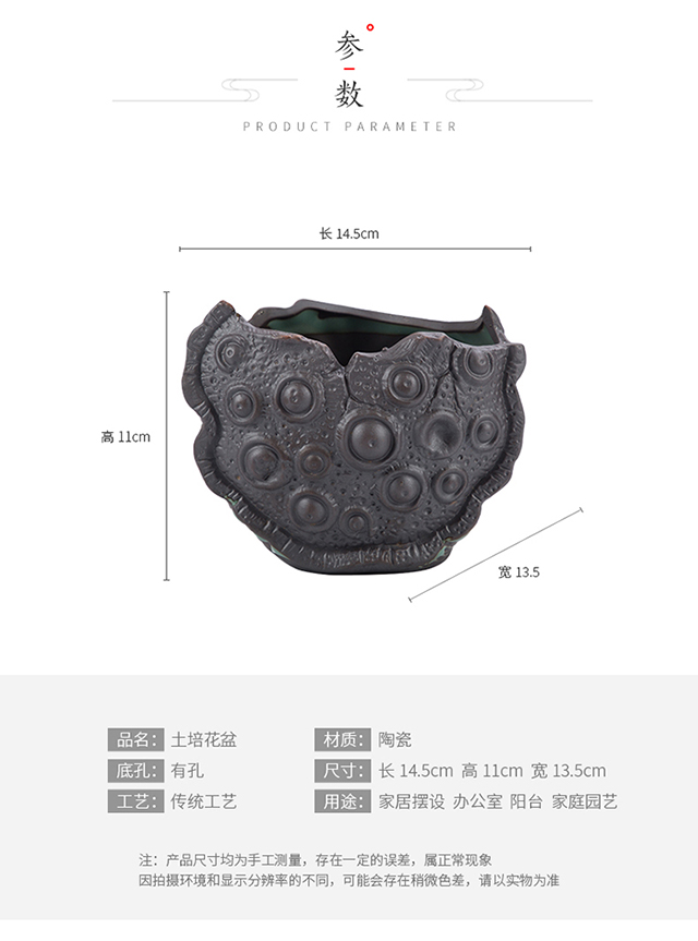 尺寸:11-15cm;材质:陶瓷;适用空间:桌面,地面;底部留孔:有孔;品牌:晨色;包装清单:花盆*1;