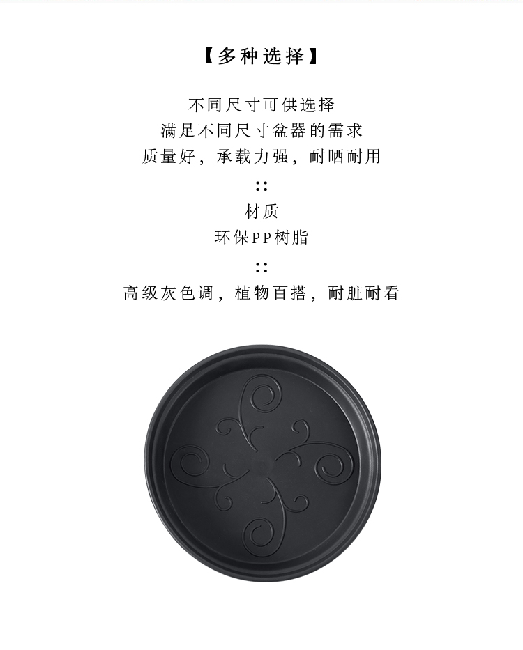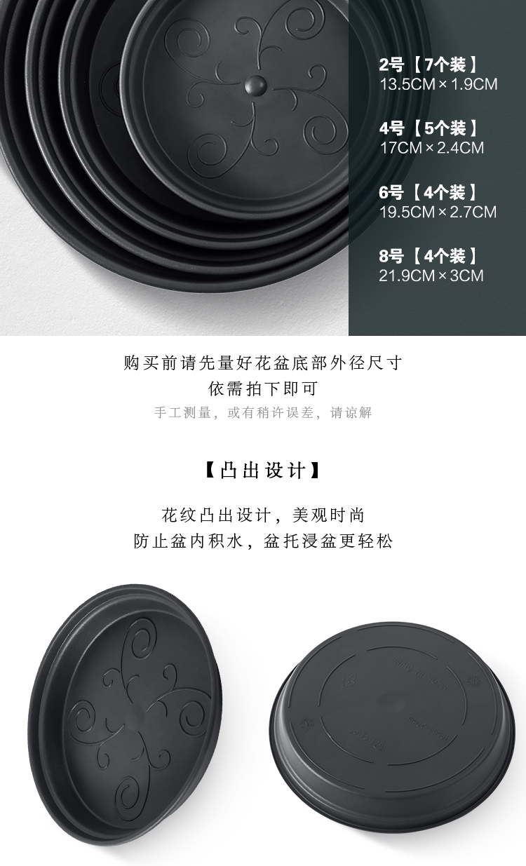 风格:田园;尺寸:21-25cm;材质:塑料;底部留孔:无孔;适用空间:桌面,地面;尺寸:21.9*3CM;品牌:芷郁;包装清单:塑料花盆托盘X4;