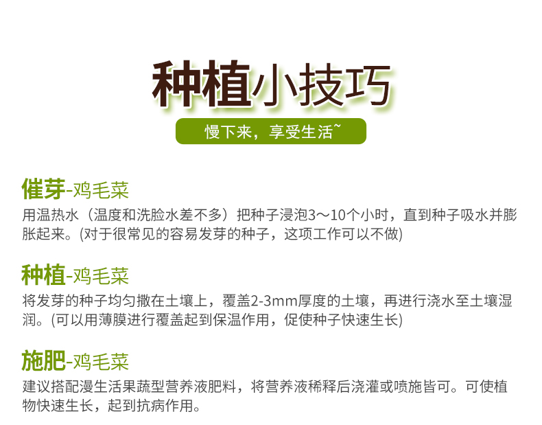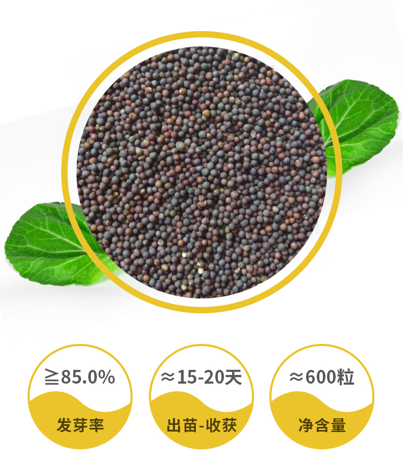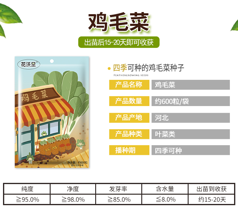 种类:叶菜类;适种区域:西北,华南,西南,华中,华东,东北,华北;适播季节:春,冬,夏,秋;国别:国产;类别:常规种子;种子经营许可证编号:D[翼沧青]农种许字(2019)第0003号;包衣:无包衣;检疫证明编号:1309220220160359;芽率(%):85%;生产年份(年):2020年;水分(%):8%;净度(%):98%;纯度(%):95%;包装清单:鸡毛菜种子1袋;