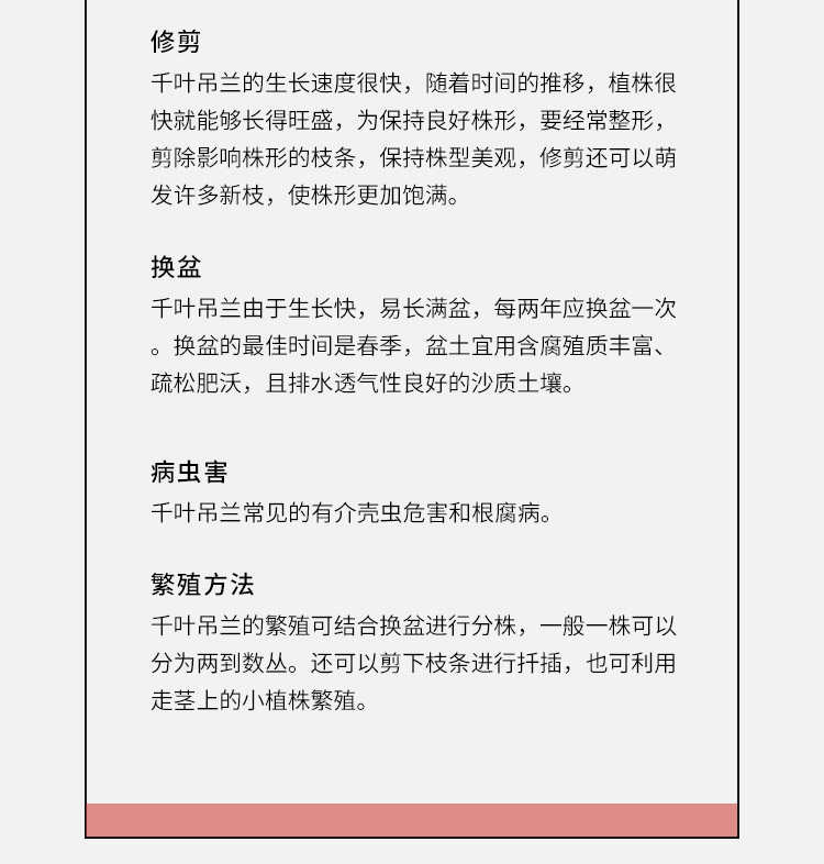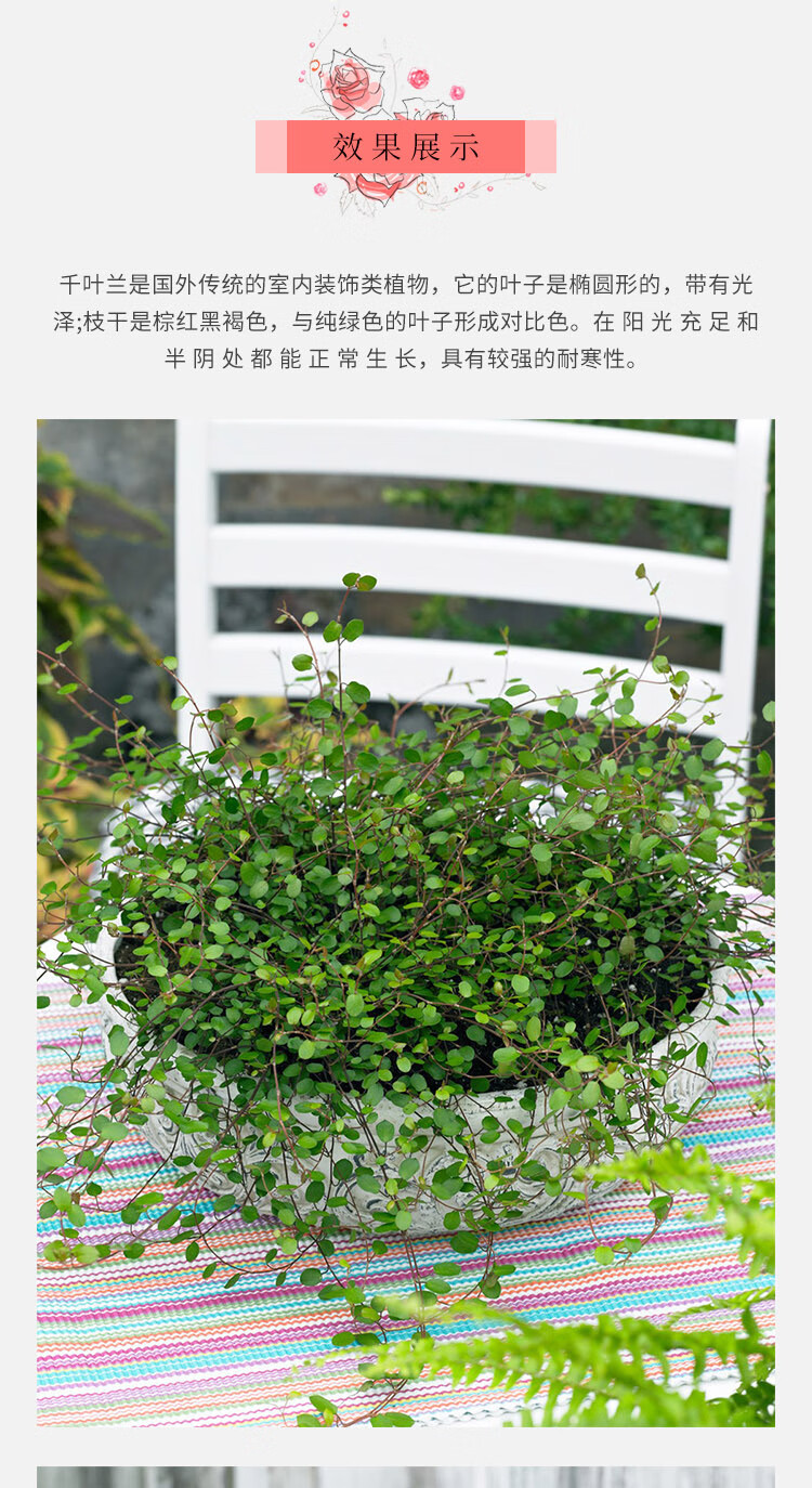 植物品种:吊兰;是否含花盆:含盆;植物类别:观叶植物;适用空间:庭院,阳台,客厅,书房;包装清单:千叶吊兰-砖红盆(含挂钩);