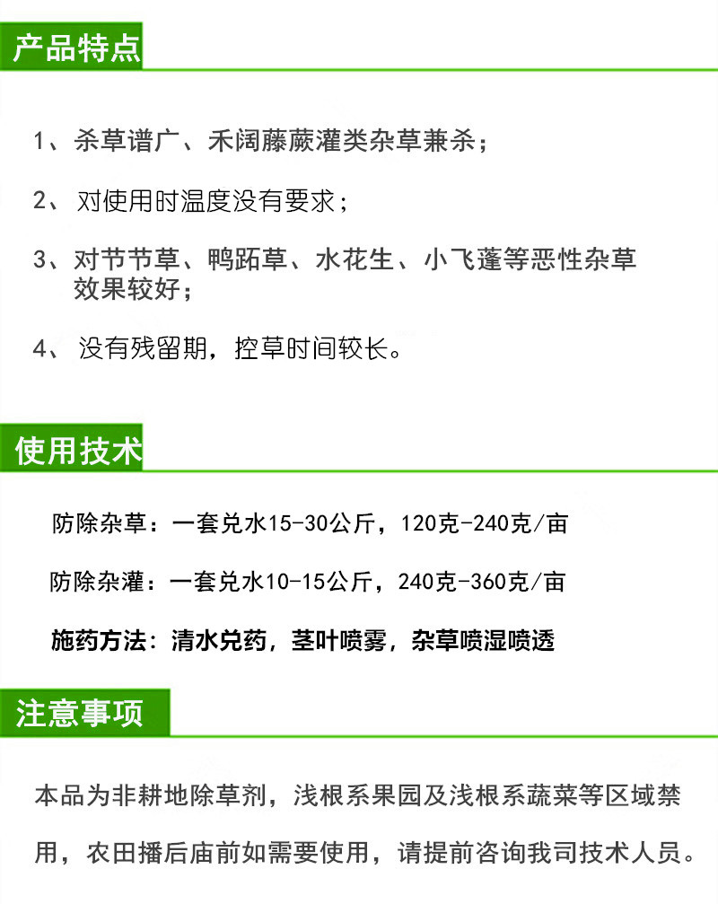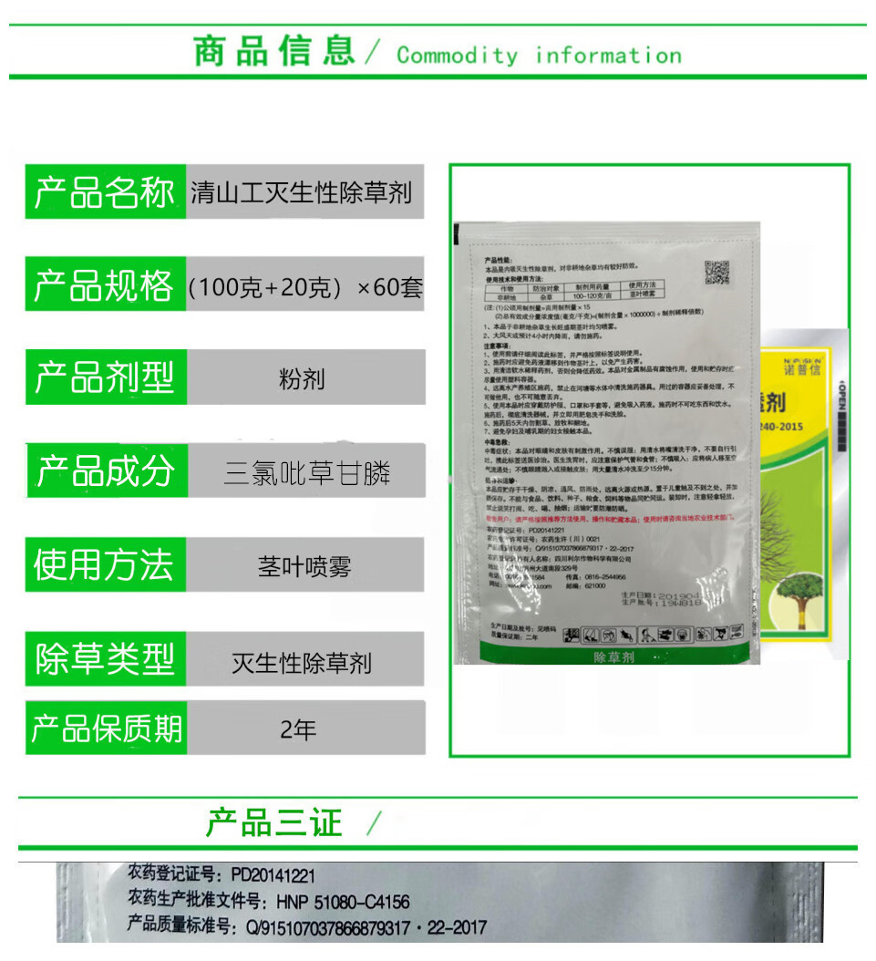 毒性:低毒;剂型:粉剂;适用作物:园林绿化,果树,非耕地区域;包装清单:(100克+20克)×60套/箱 7.2公斤/箱;