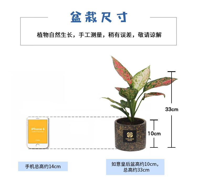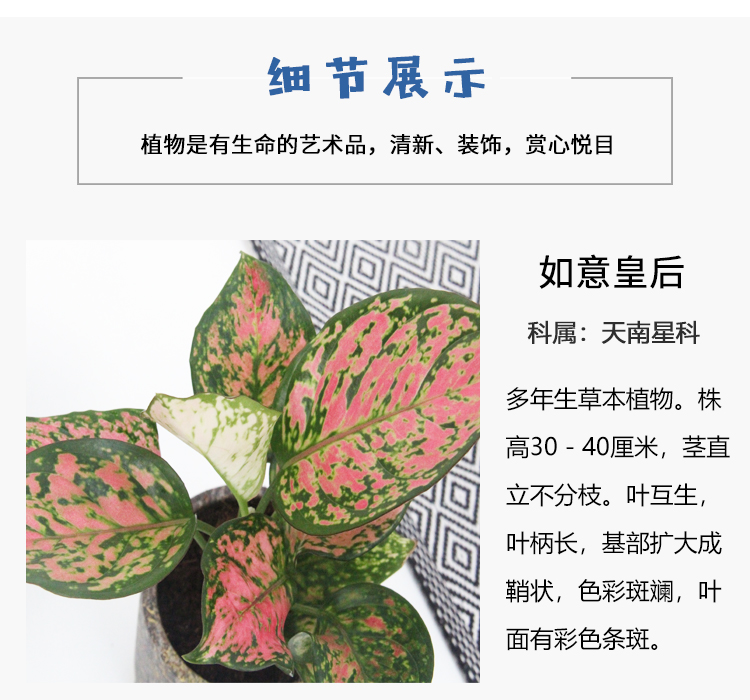 植物品种:其它;是否含花盆:含盆;植物类别:观叶植物;适用空间:阳台,客厅,办公桌,书房;包装清单:如意皇后x1,花盆x1;