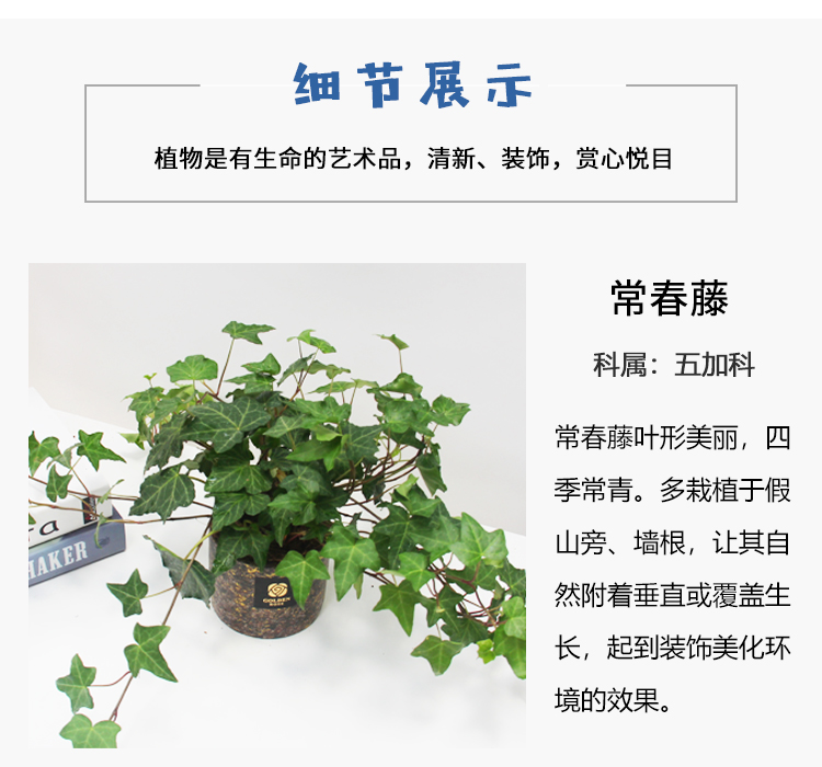 植物品种:常春藤;是否含花盆:含盆;植物类别:观叶植物;适用空间:阳台,客厅,办公桌,书房;包装清单:常春藤x1,花盆x1;