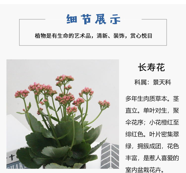 是否含花盆:含盆;植物品种:其它;植物类别:观叶植物;适用空间:阳台,书房,客厅,办公桌;包装清单:长寿花x1,花盆x1;