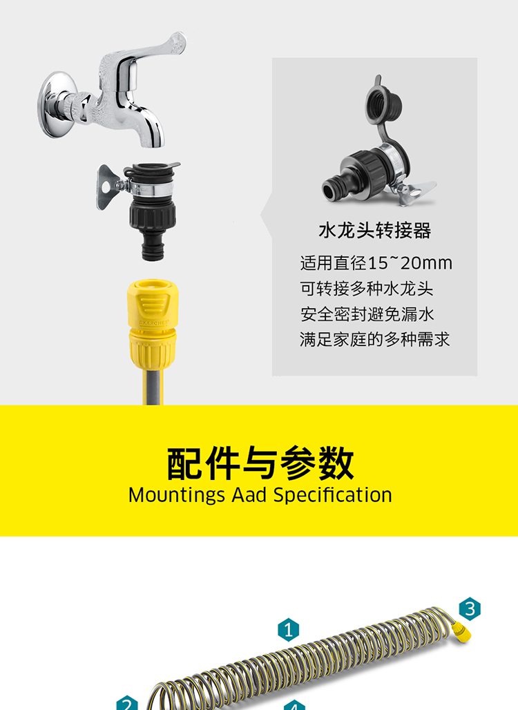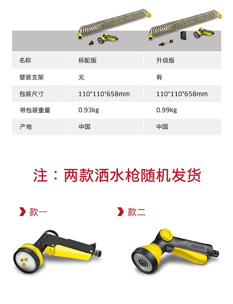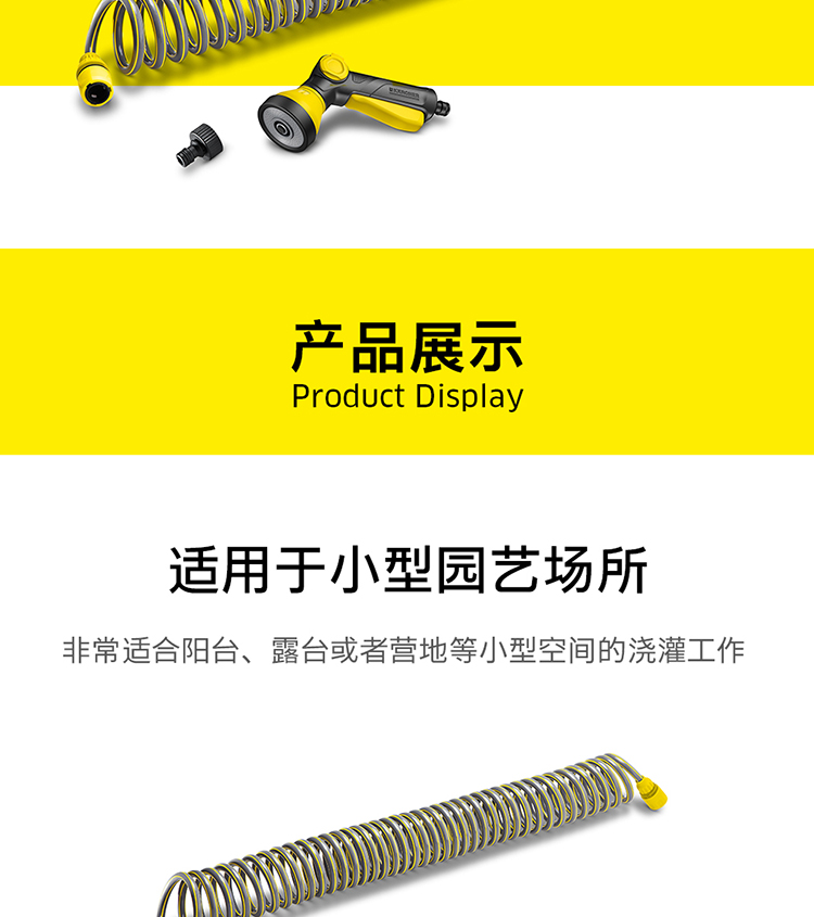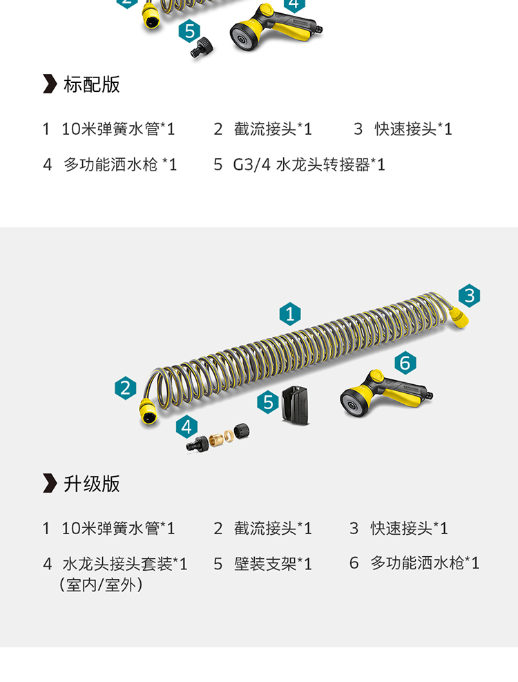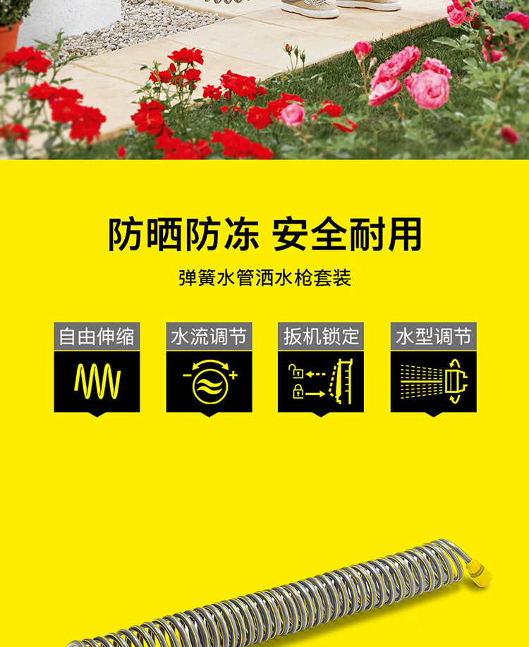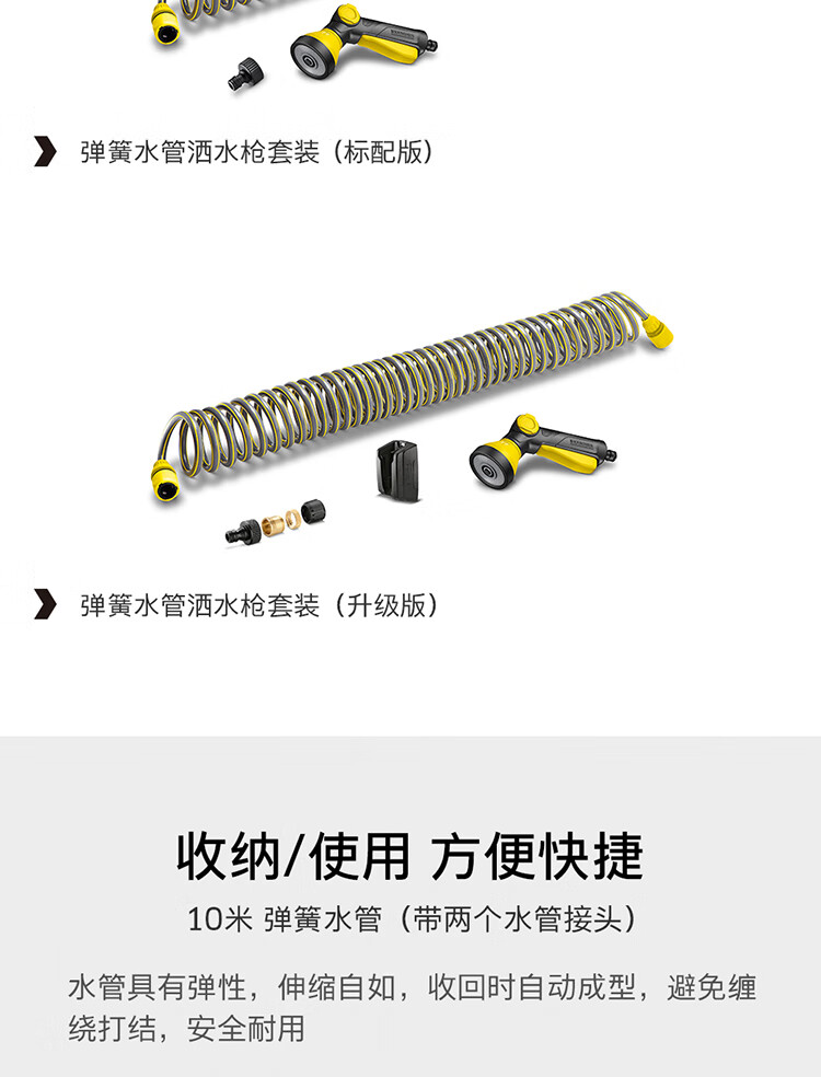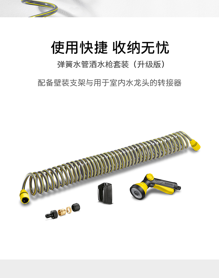 材质:树脂/PVC;国产/进口:国产;分类:水枪/水管/水管车;品牌:卡赫(KARCHER);包装清单:10m弹簧水管*1 截流接头*1 快速接头*1 多功能洒水枪*1 G3/4水龙头转接器*1;