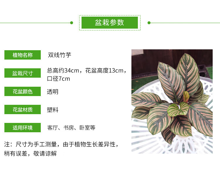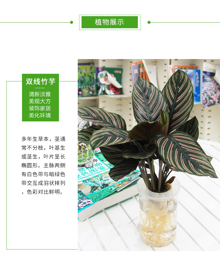 植物品种:其它;是否含花盆:含盆;植物类别:水培植物;适用空间:阳台,客厅,办公桌,书房;包装清单:双线竹芋X1 、 塑料盆X1;