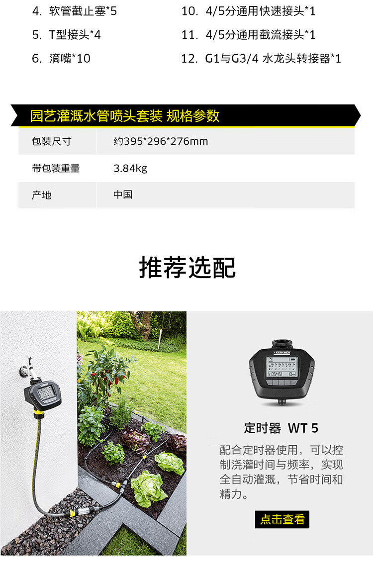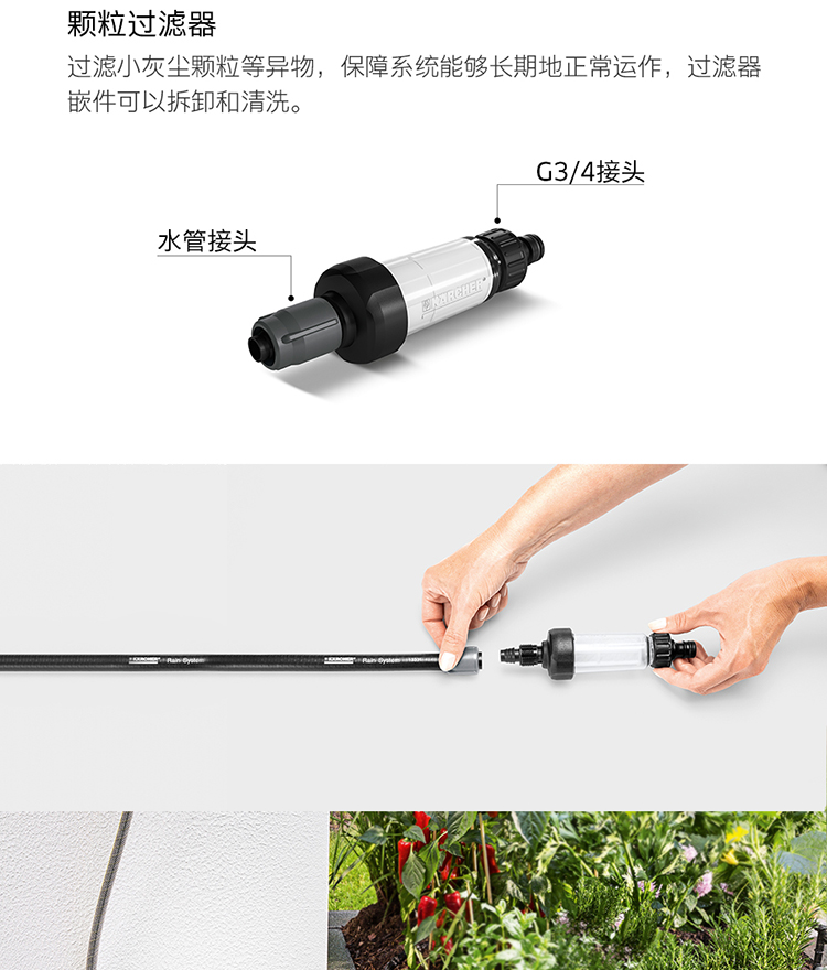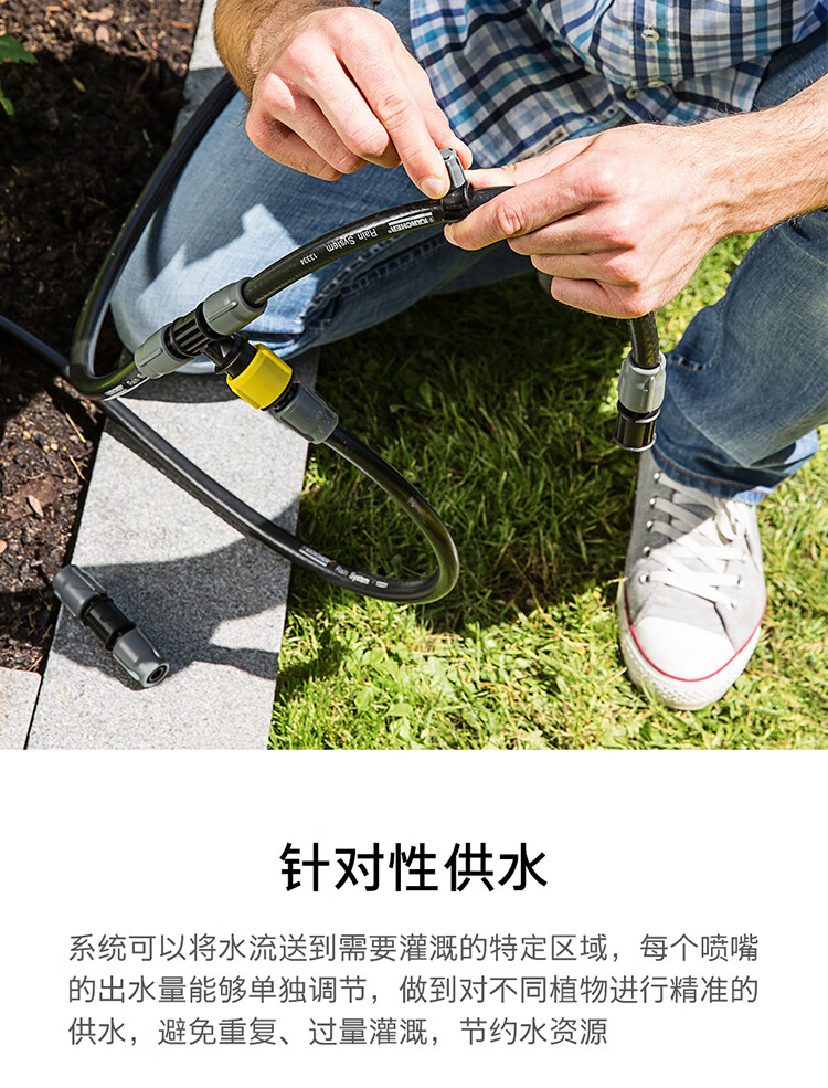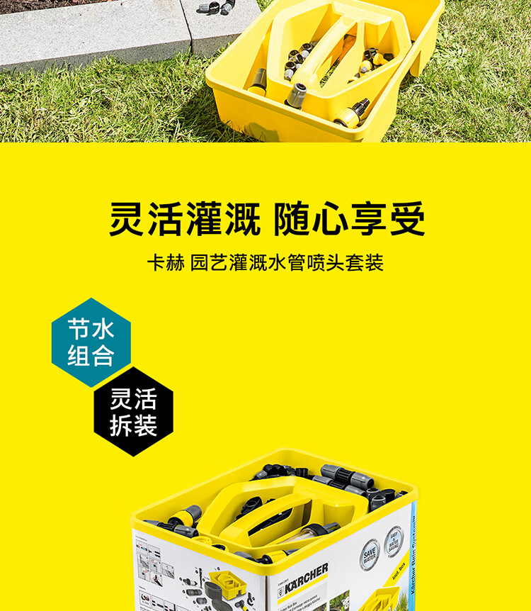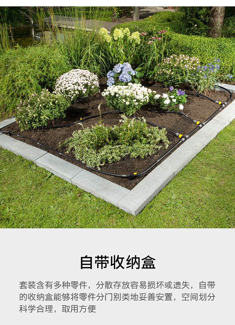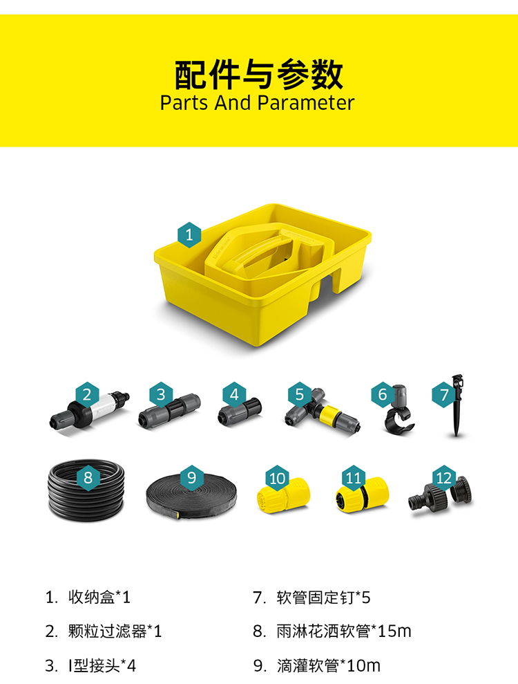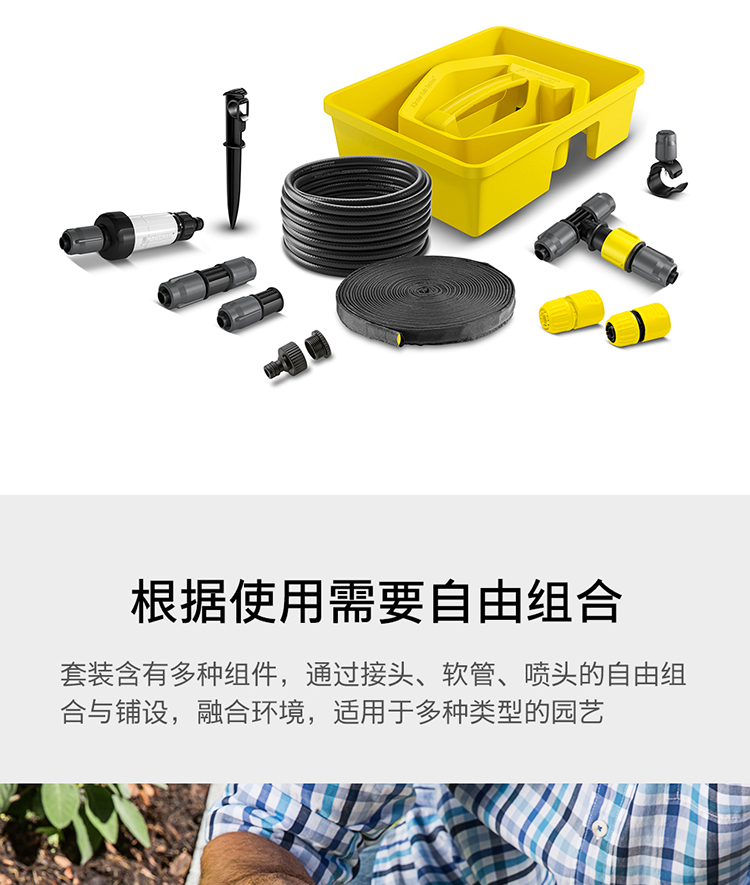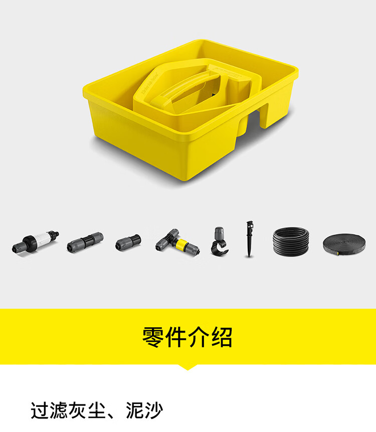 分类:滴灌;品牌:卡赫(KARCHER);包装清单:收纳盒*1 颗粒过滤器*1 I型接头*4 软管截止塞*5 T型接头*4 滴嘴*10 软管固定钉*5 雨淋花洒软管*15m 滴灌软管*10m 4/5分通用快速接头*1 4/5分通用截流接头*1 G1与G3/4水龙头转接器*1;