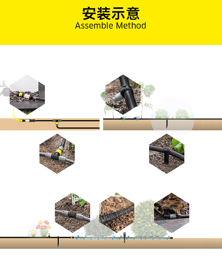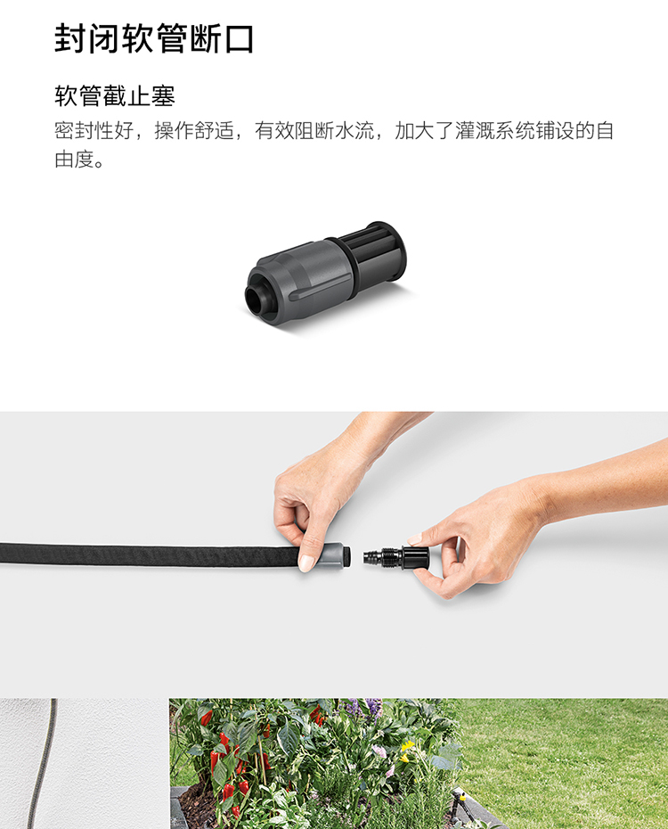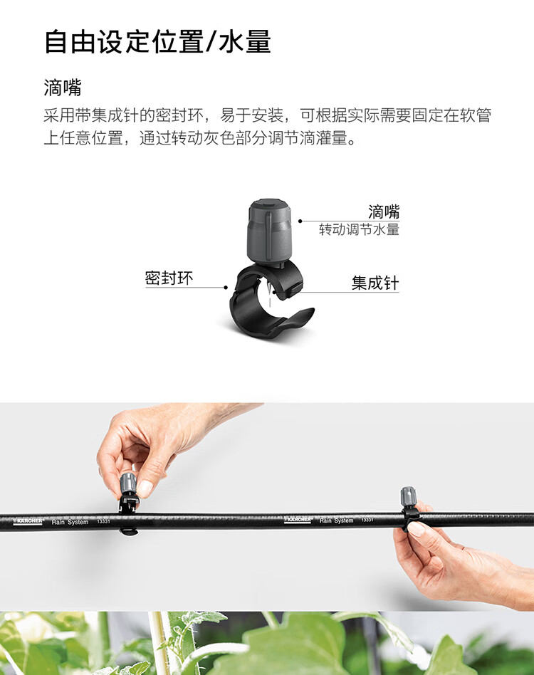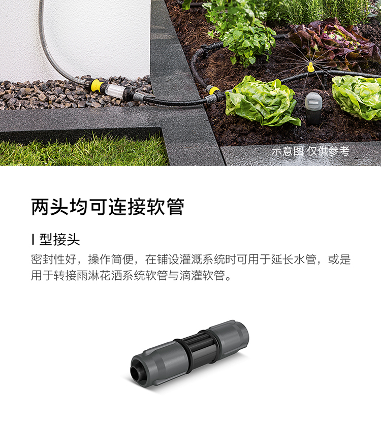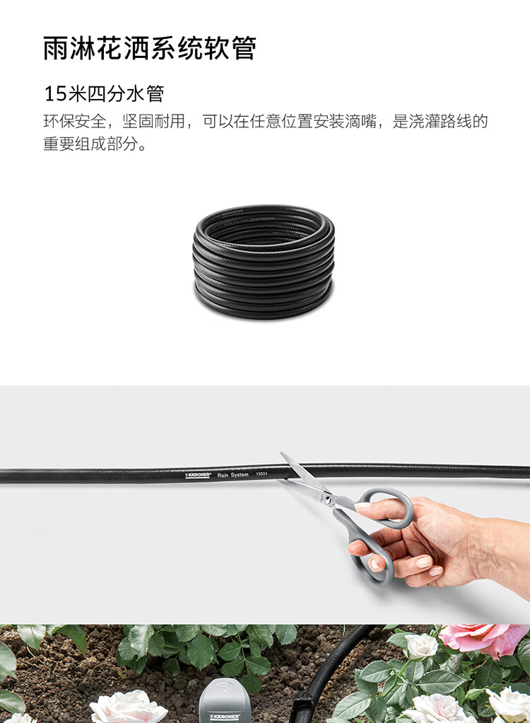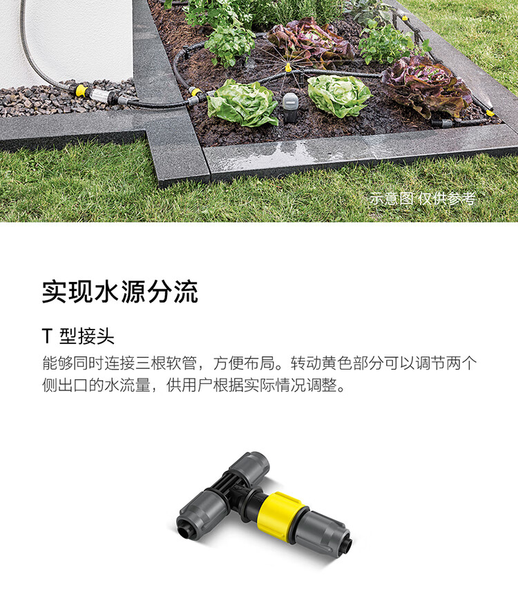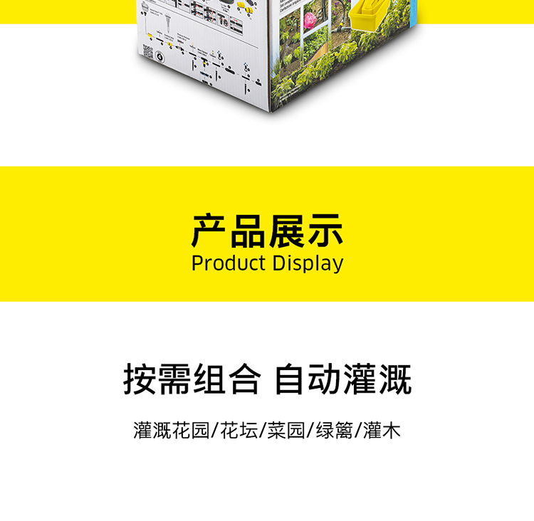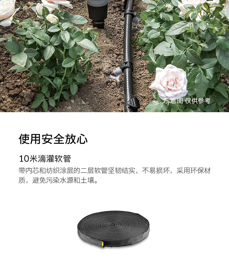 分类:滴灌;品牌:卡赫(KARCHER);包装清单:收纳盒*1 颗粒过滤器*1 I型接头*4 软管截止塞*5 T型接头*4 滴嘴*10 软管固定钉*5 雨淋花洒软管*15m 滴灌软管*10m 4/5分通用快速接头*1 4/5分通用截流接头*1 G1与G3/4水龙头转接器*1;