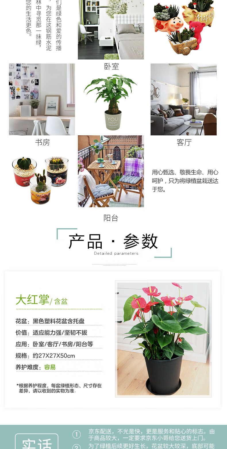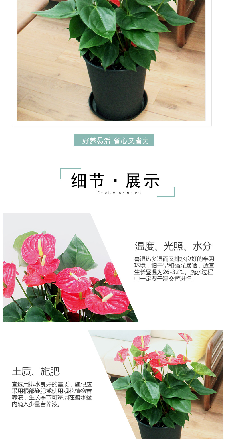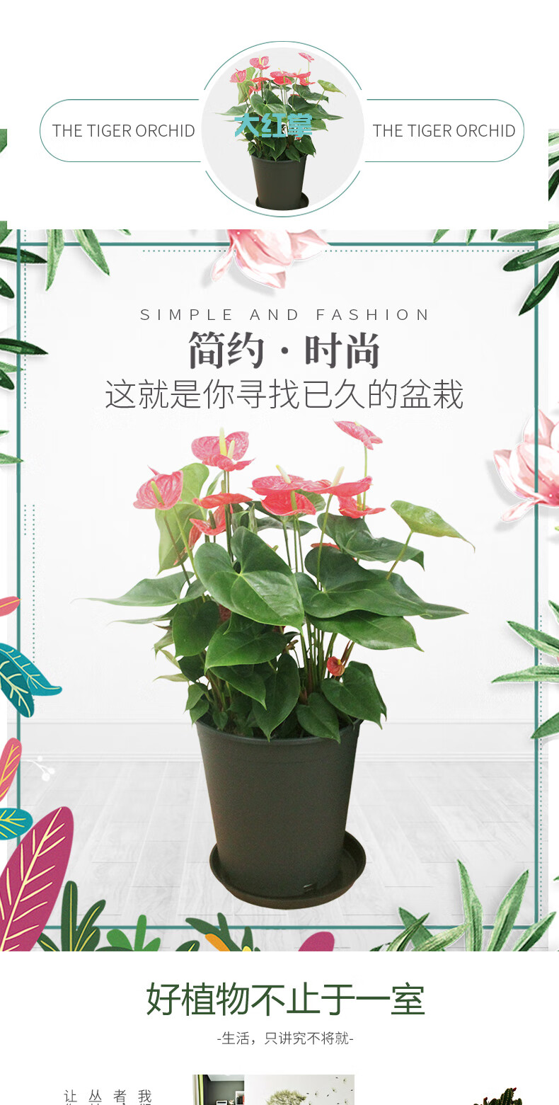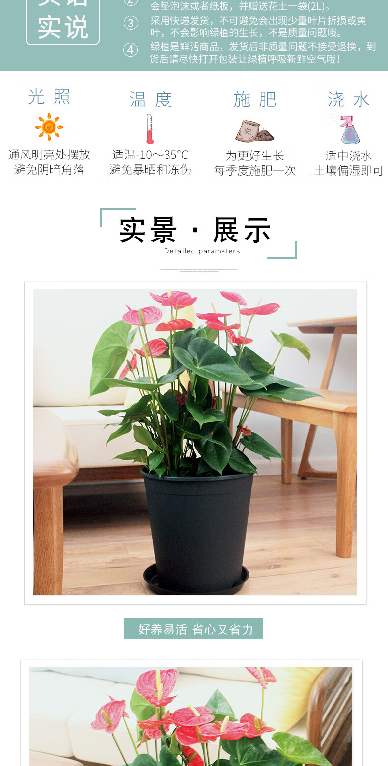 植物品种:其它;是否含花盆:含盆;整体高度:51cm-80cm;是否开花:是;适用空间:办公室,接待前台,书房,客厅;品牌:花七休;包装清单:红掌×1、加厚黑色塑料花盆×1、黑色塑料托盘、包装箱×1;