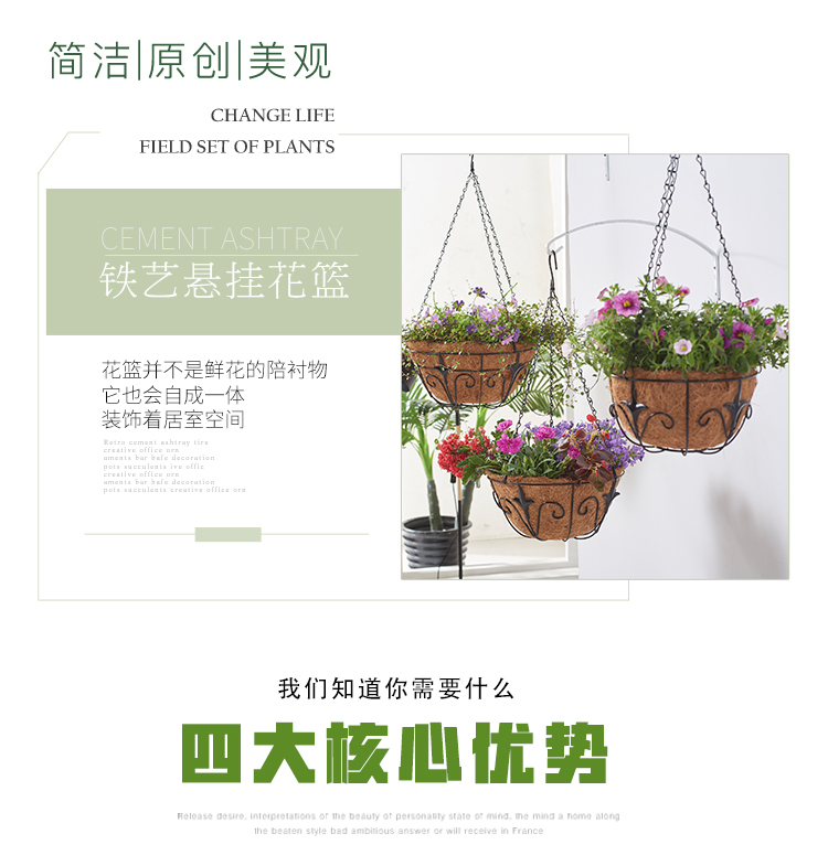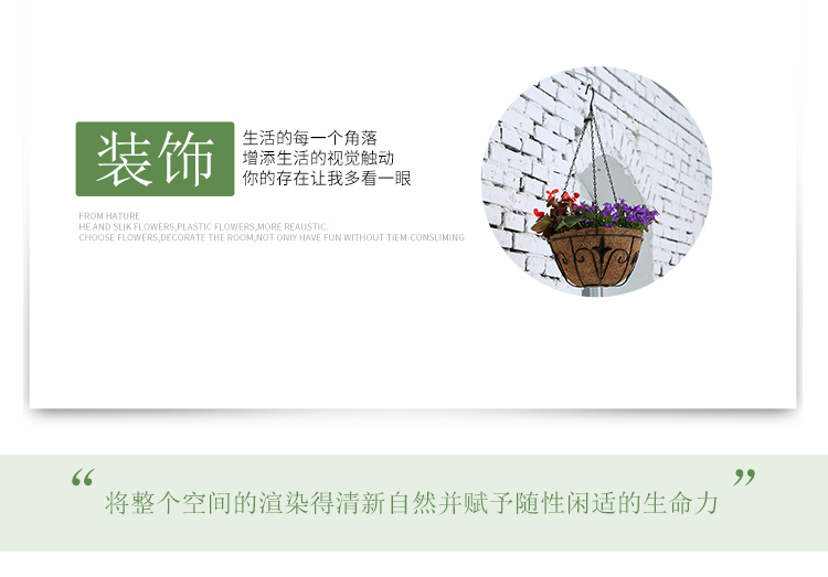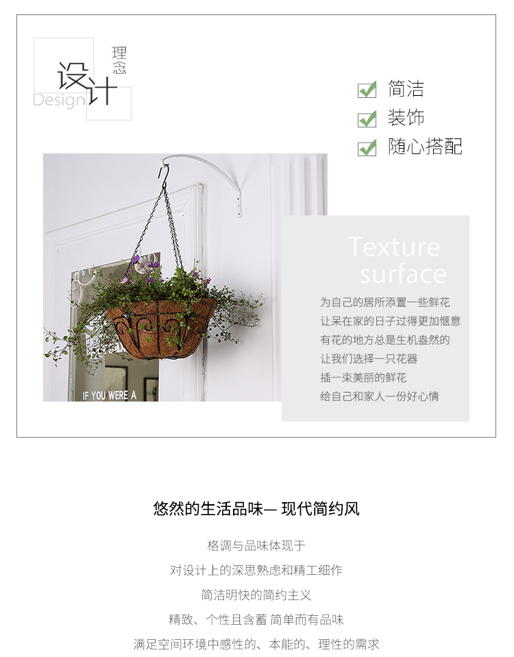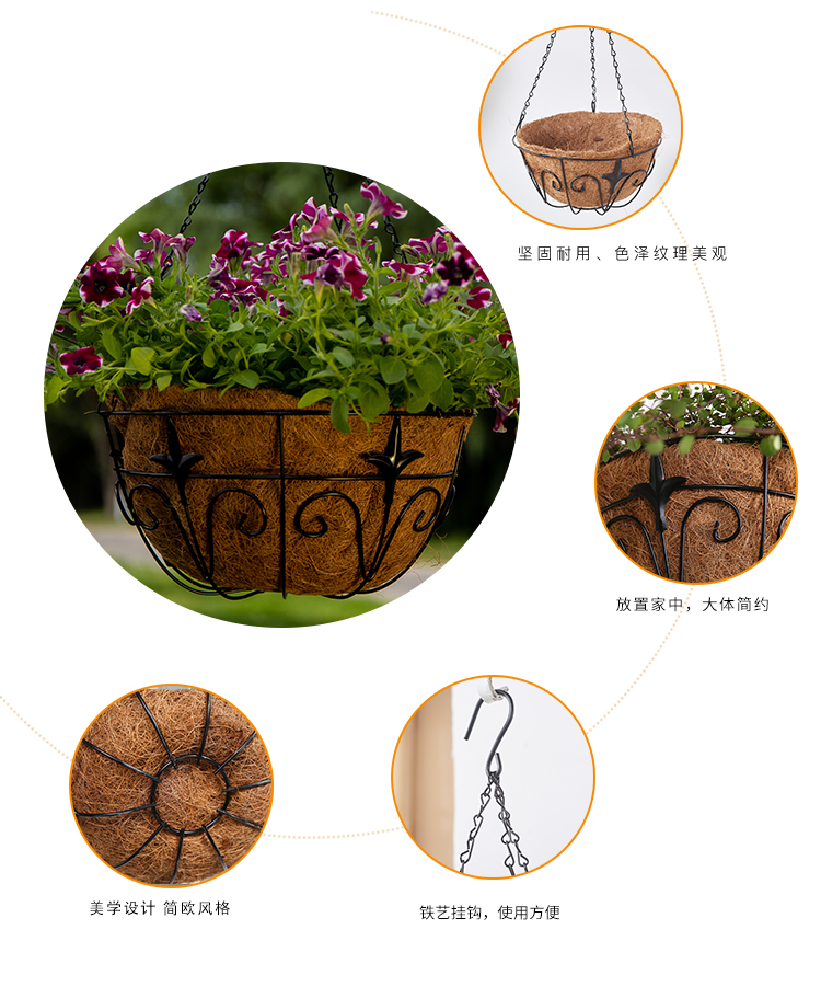 风格:田园;附加功能:悬挂;尺寸:31cm以上;材质:金属;底部留孔:有孔;适用空间:垂吊;品牌:叶哇;包装清单:椰棕垫*2、铁链*2、挂钩*2、金属花篮*2;