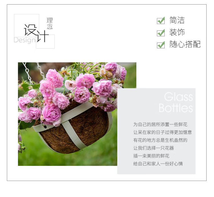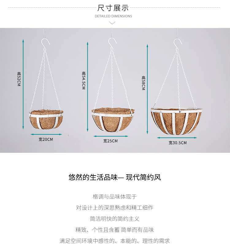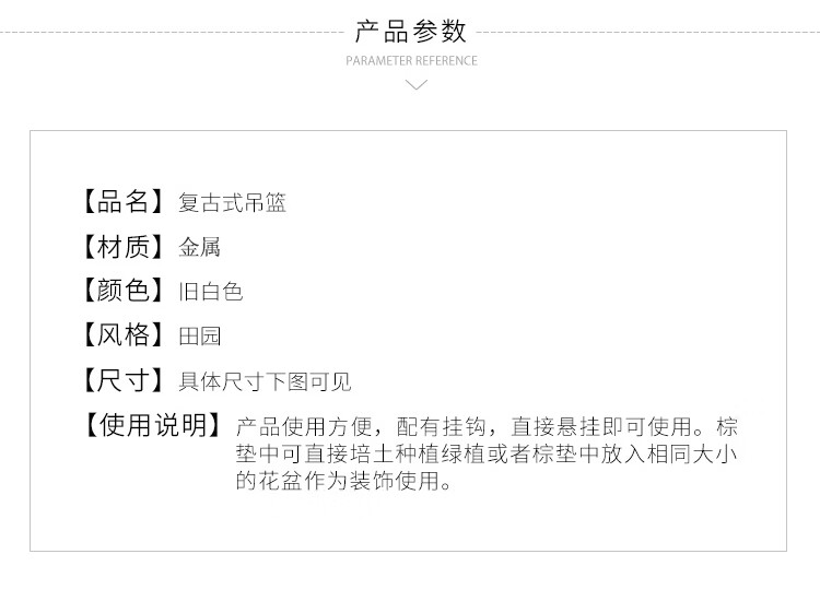 风格:田园;附加功能:悬挂;尺寸:31cm以上;材质:金属;适用空间:垂吊;底部留孔:有孔;品牌:叶哇;包装清单:椰棕垫*2、铁链*2、挂钩*2、金属花篮*2;