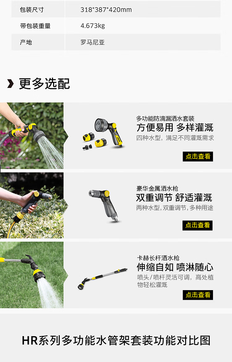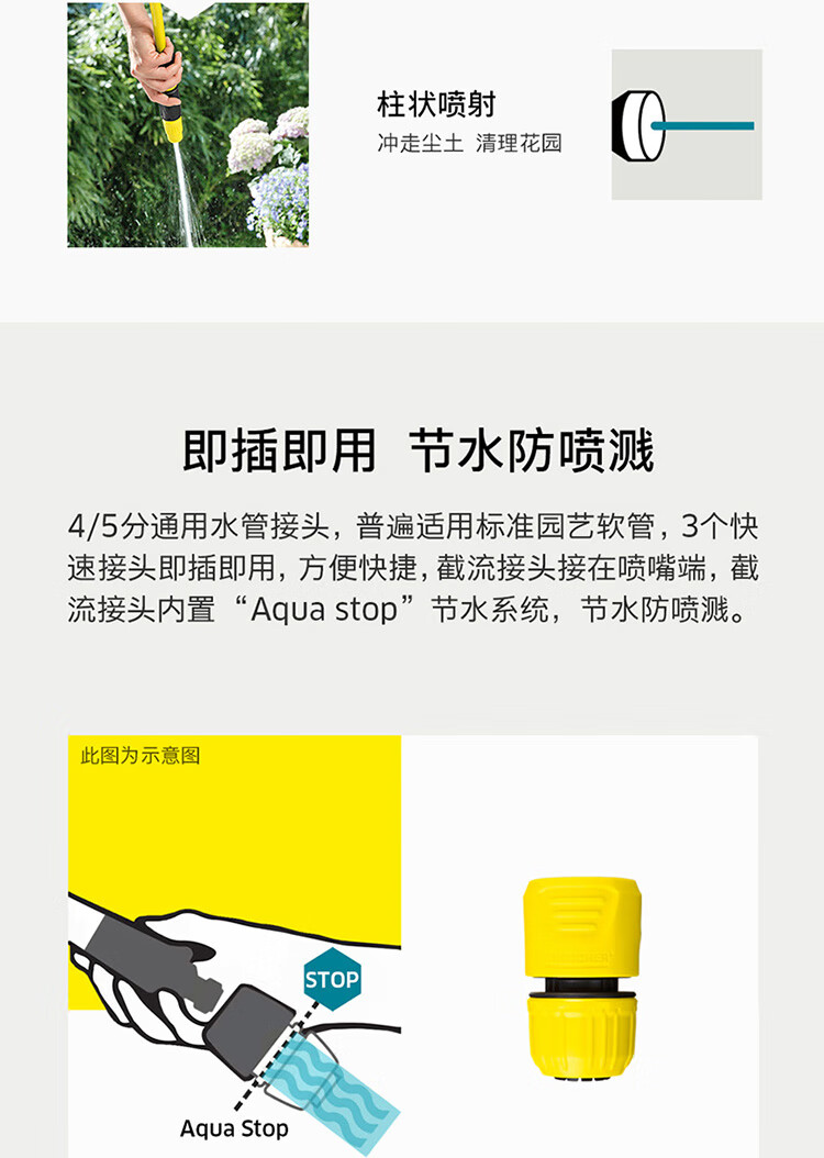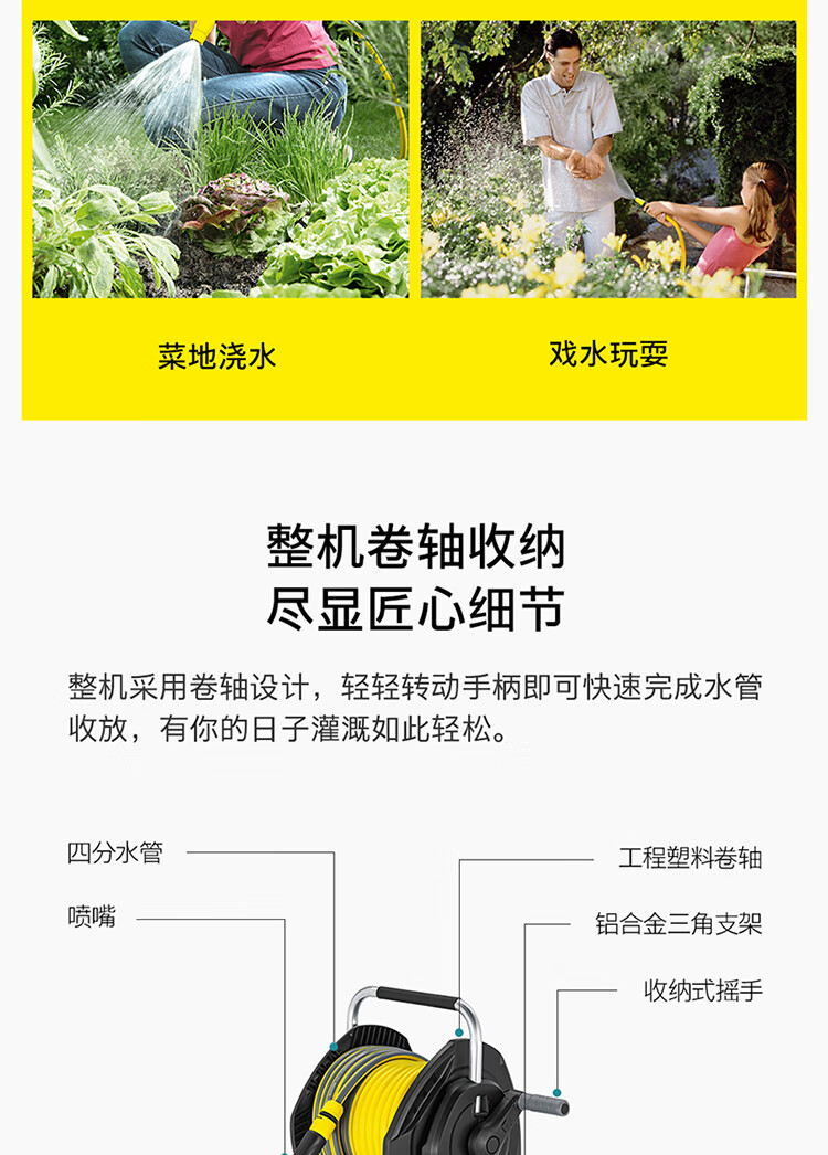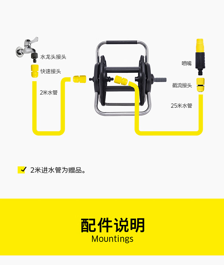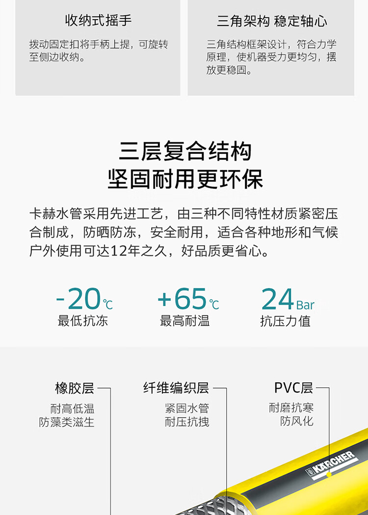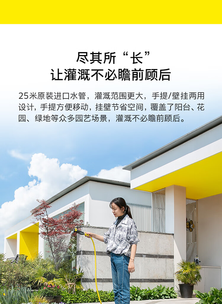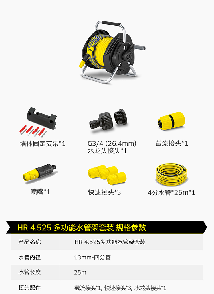材质:树脂/PVC;国产/进口:进口;分类:水枪/水管/水管车;品牌:卡赫(KARCHER);包装清单:墙体固定支架*1 水龙头接头*1 截流接头*1 喷嘴*1 快速接头*3 耐压水管25m*1;