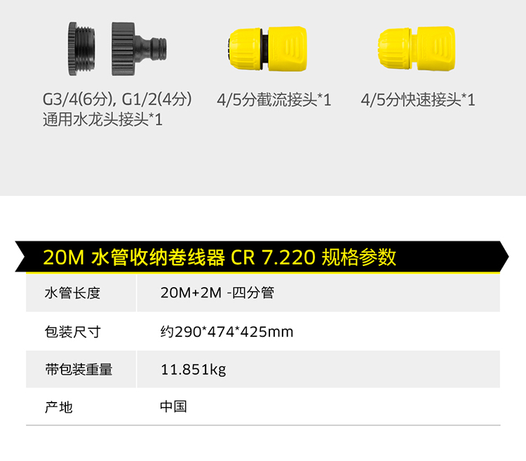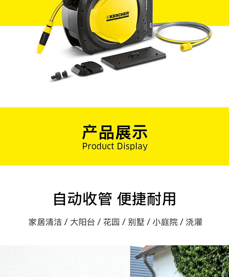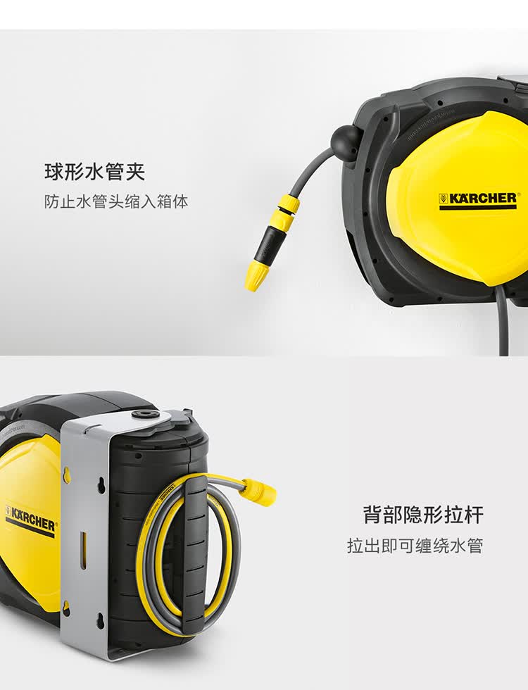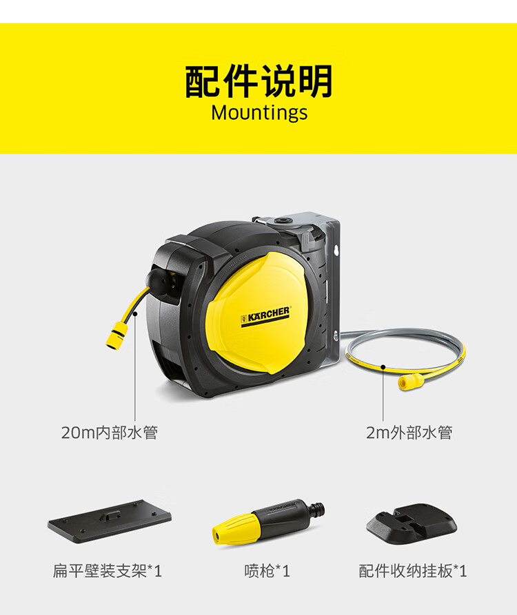 材质:树脂/PVC;国产/进口:国产;分类:水枪/水管/水管车;品牌:卡赫(KARCHER);包装清单:20M内部水管*2M外部水管*1 扁平壁装支架*1 喷枪*1 配件收纳挂板*1 通用水龙头接头*1 4/5分截流接头*1 4/5分快速接头*1;