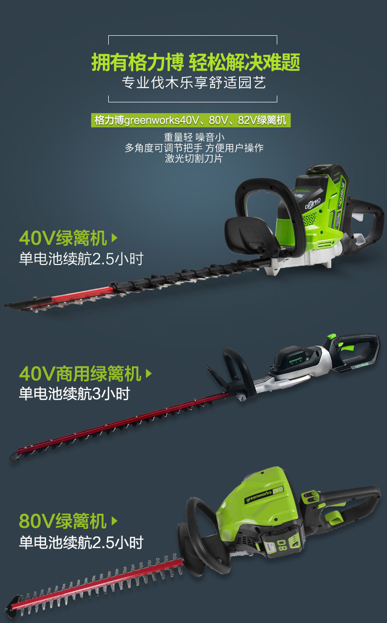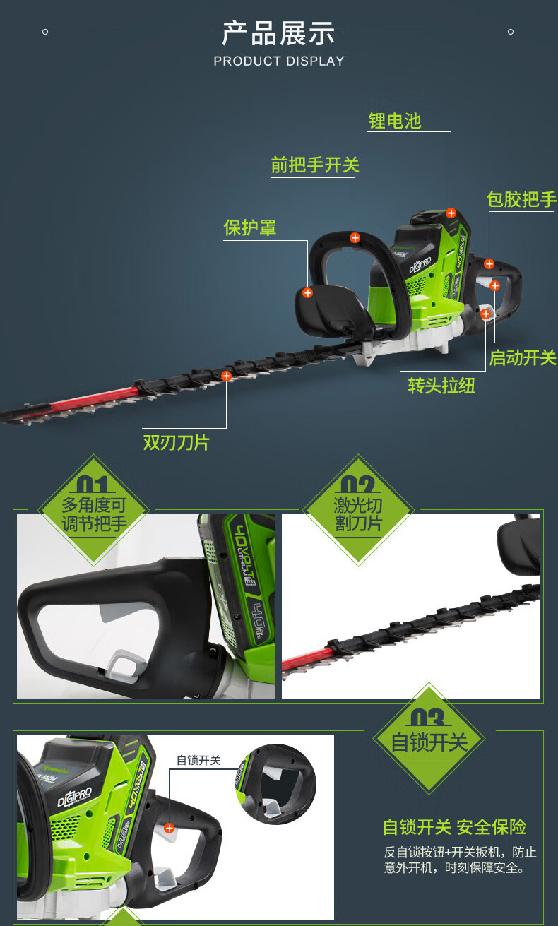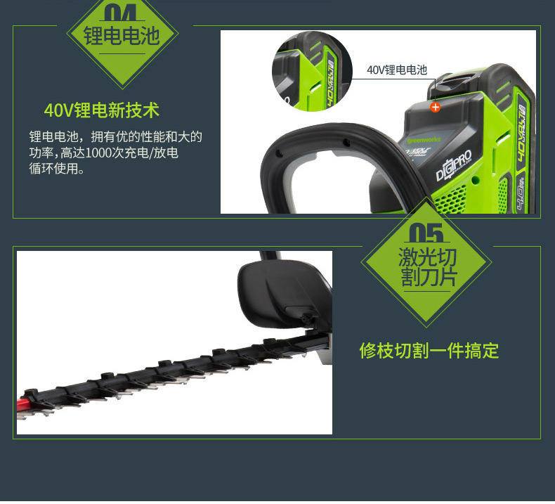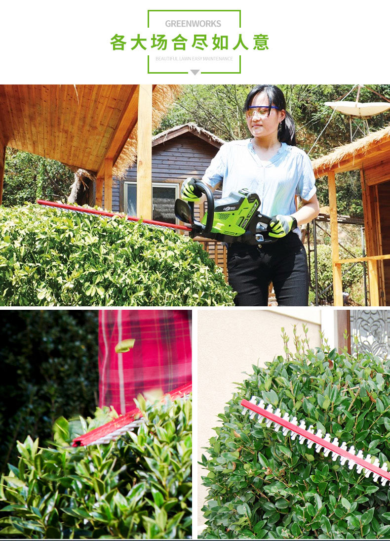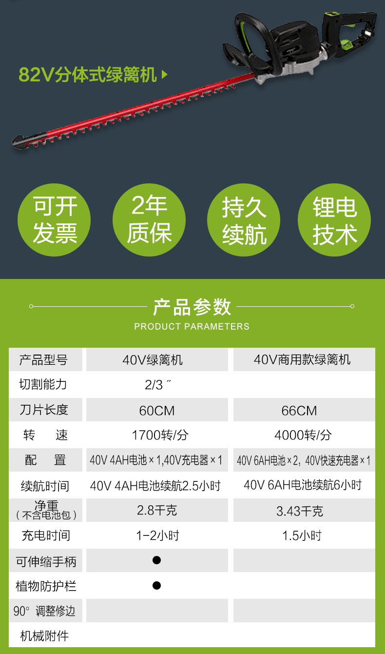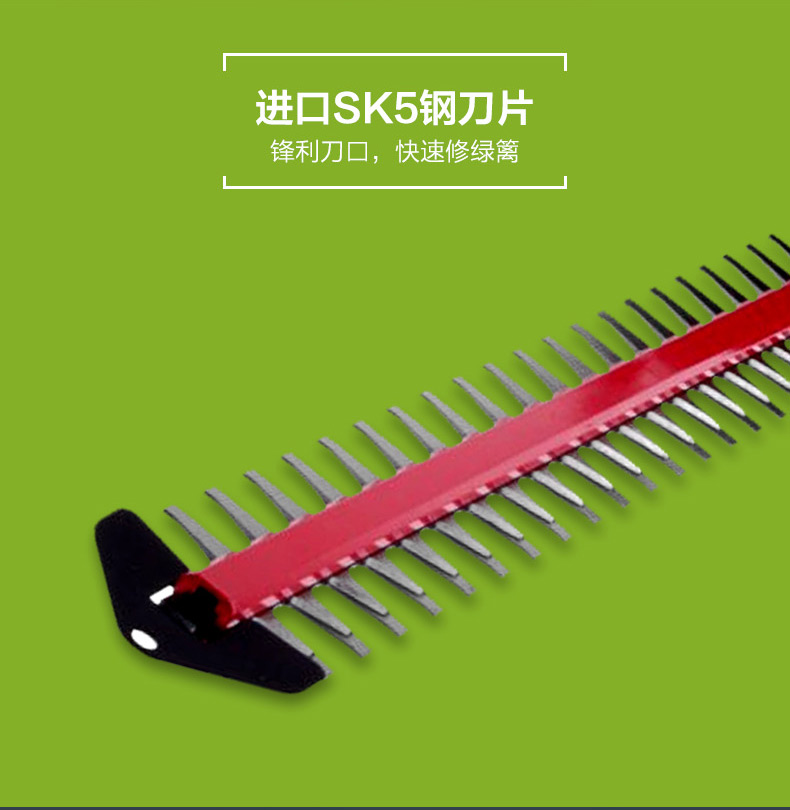 适用对象:路旁树篱;机械类型:绿篱修剪机;动力类型:电动;包装清单:裸机*1; 充电器*1; 电池*2; 说明书*1;