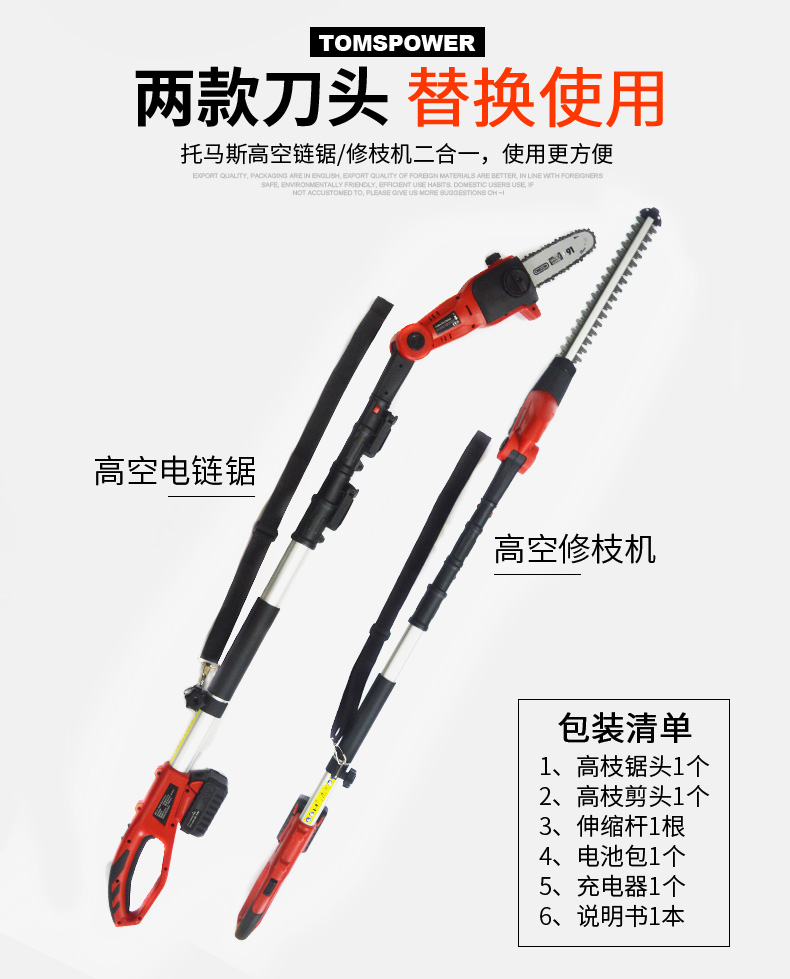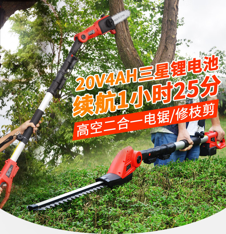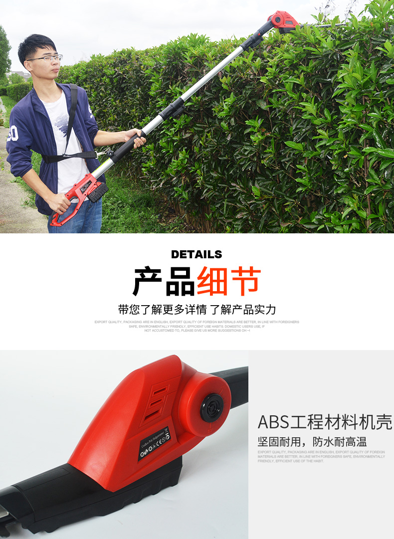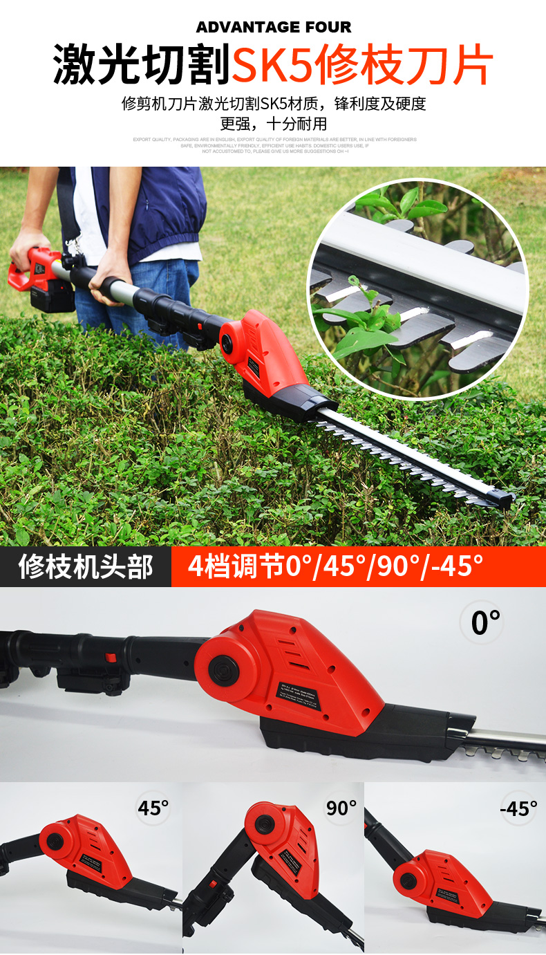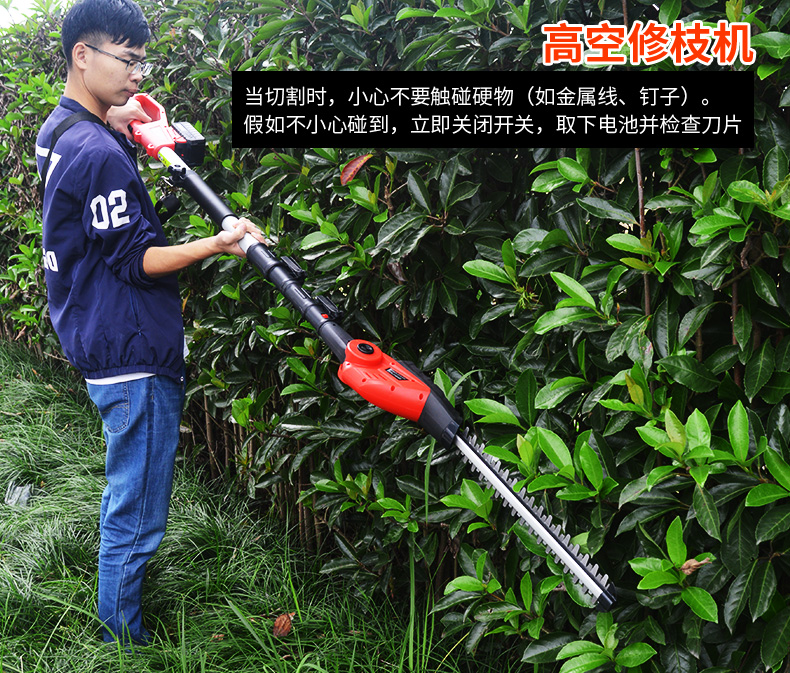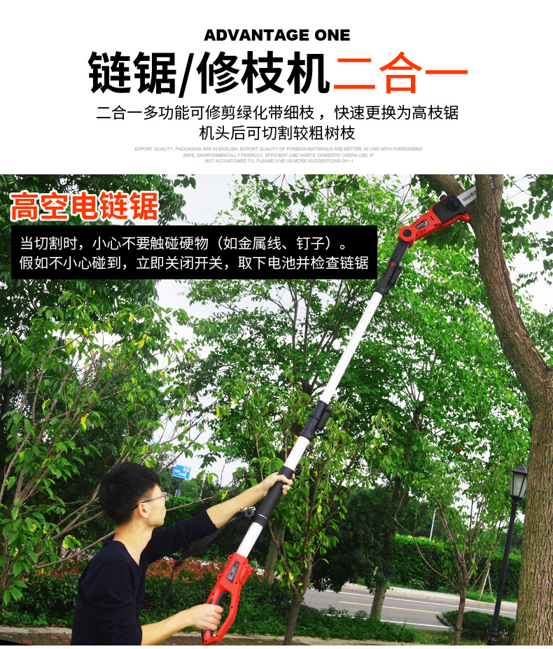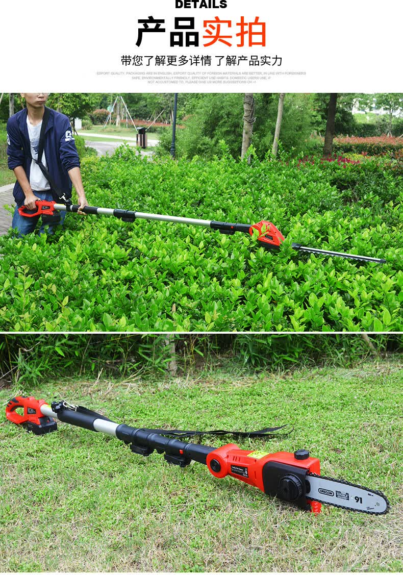 适用对象:树木,路旁树篱;机械类型:绿篱修剪机;动力类型:电动;包装清单:电动高枝锯*1,高枝剪头*1,充电器*1,锂电池*1,说明书*1;