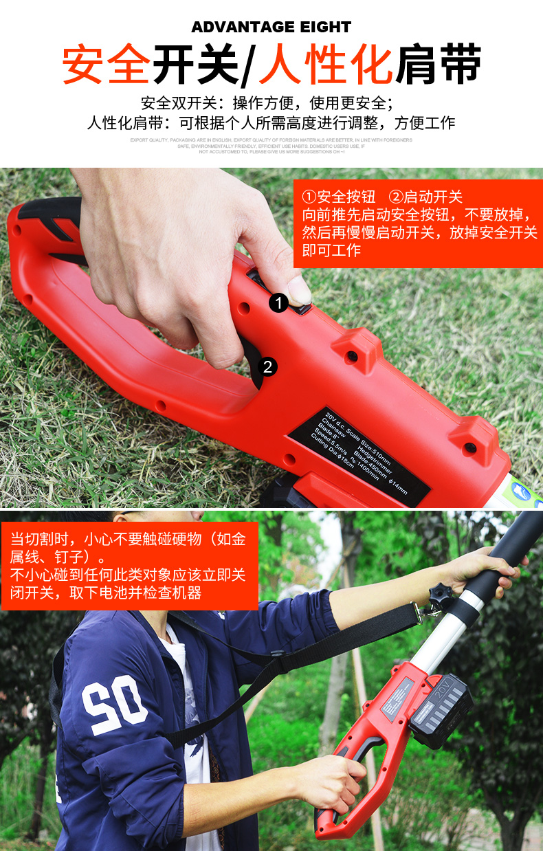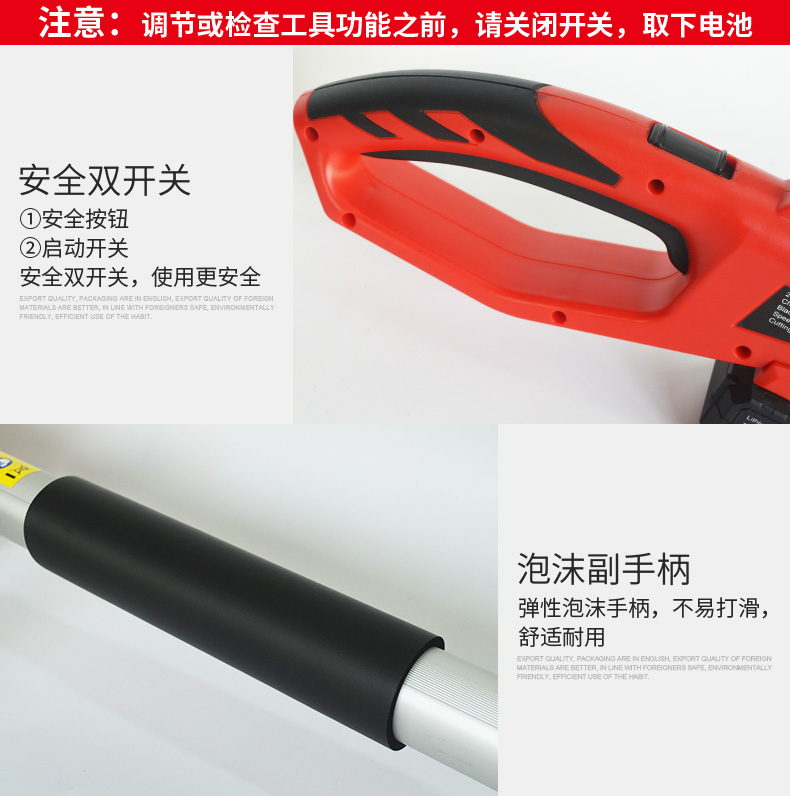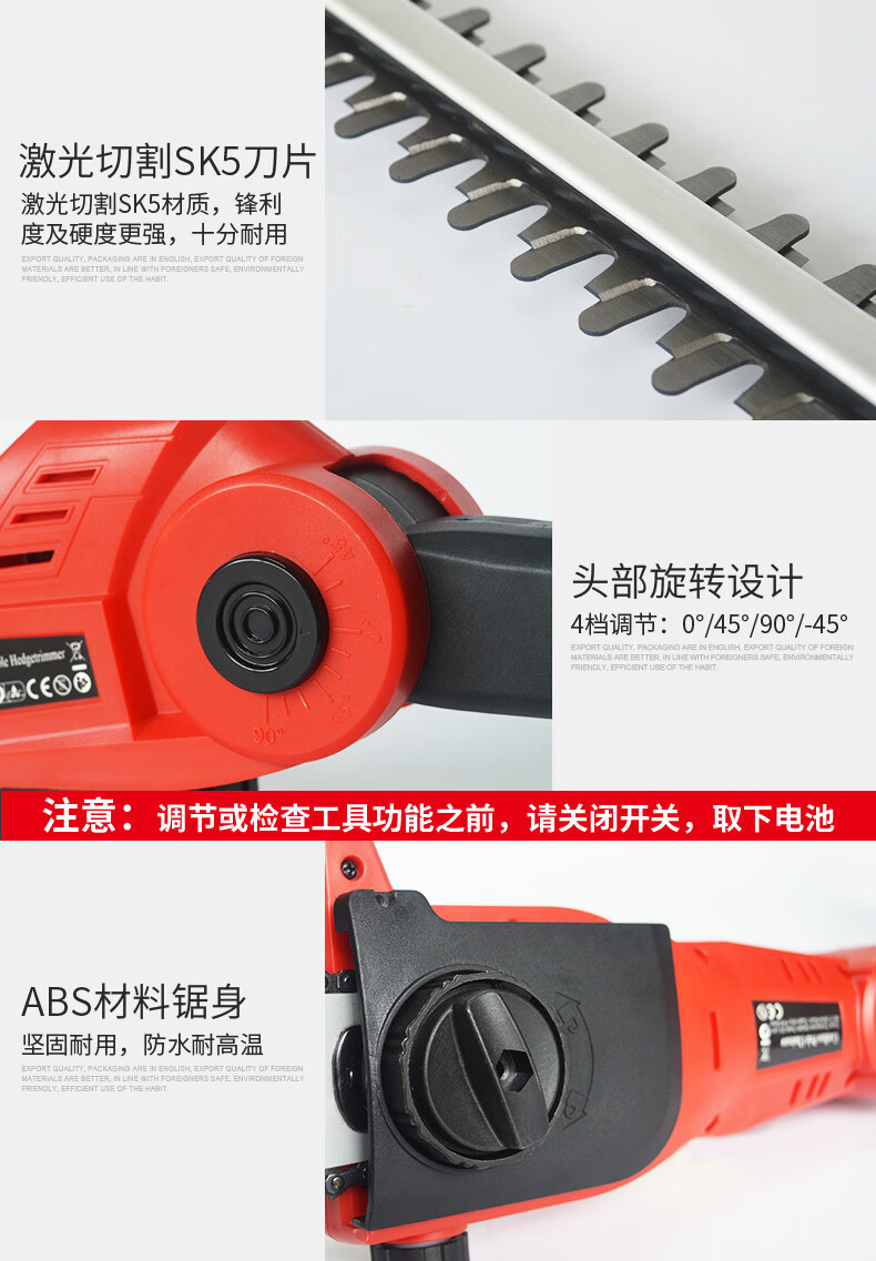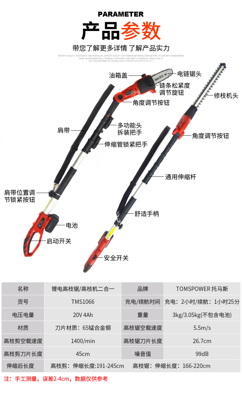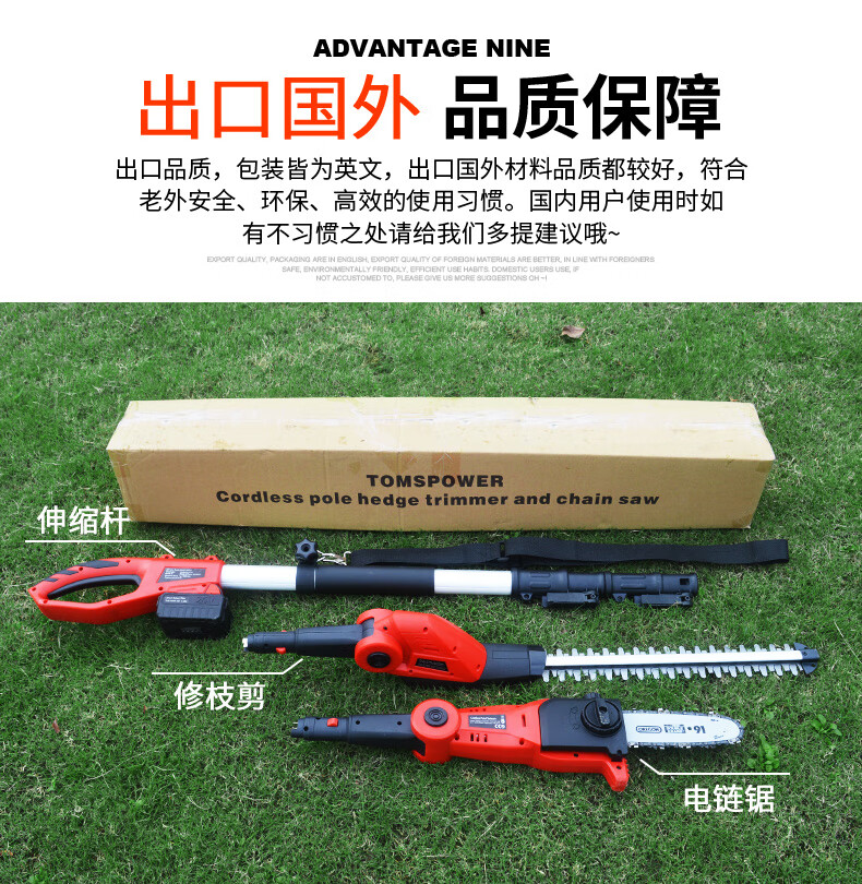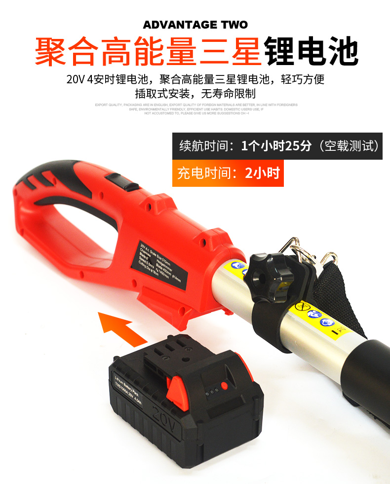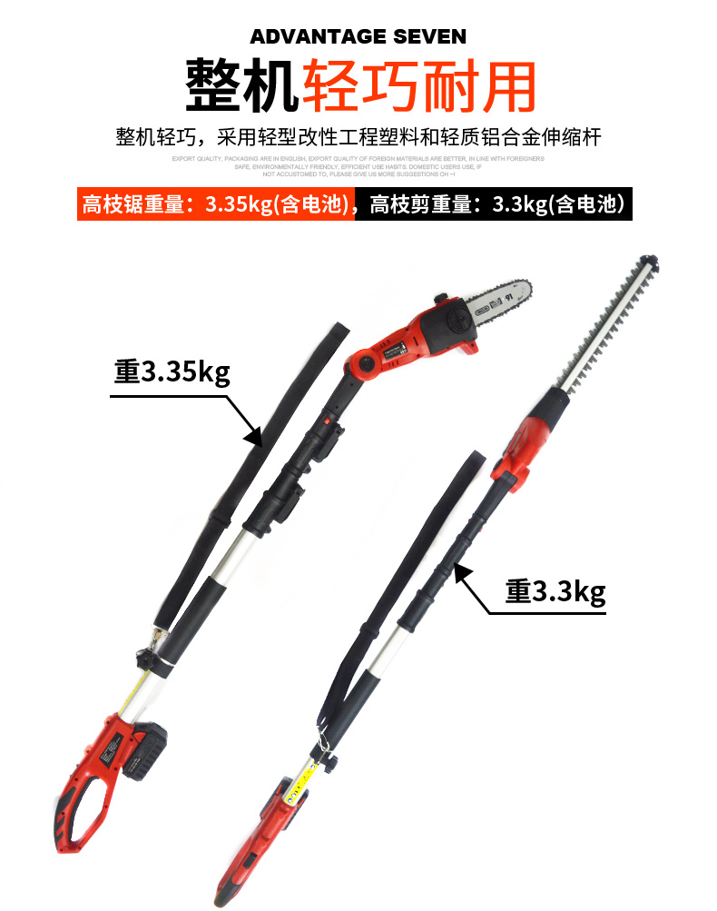 适用对象:树木,路旁树篱;机械类型:绿篱修剪机;动力类型:电动;包装清单:电动高枝锯*1,高枝剪头*1,充电器*1,锂电池*1,说明书*1;