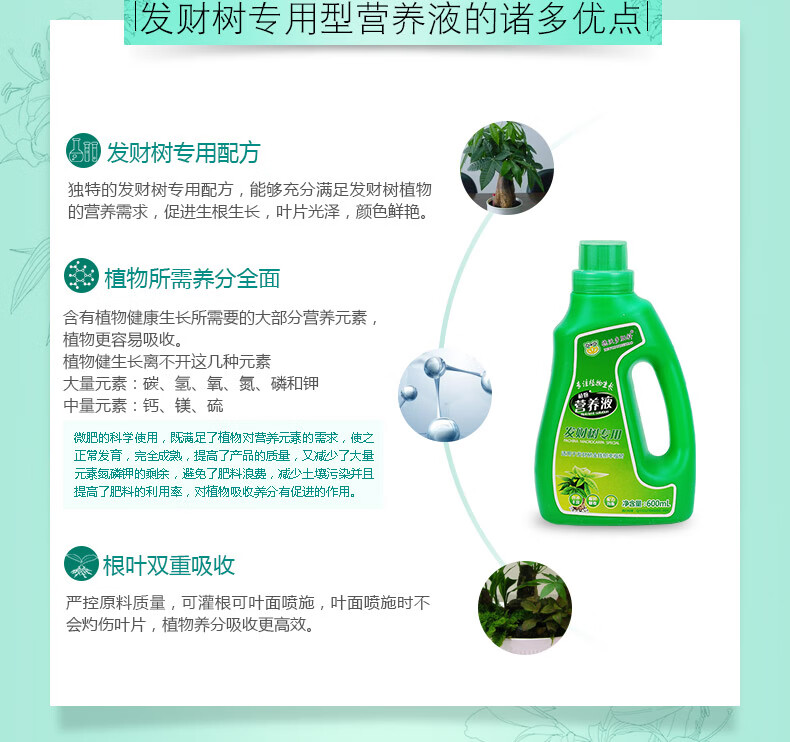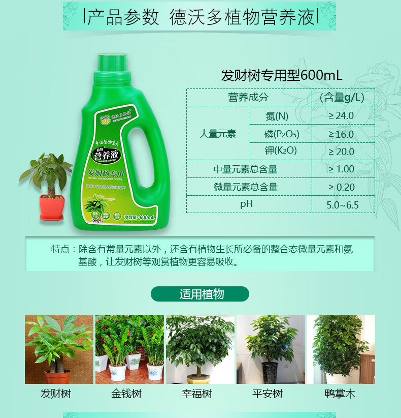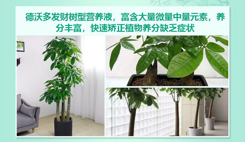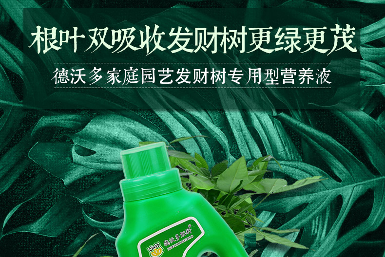 适用对象:其它;性状:液体;营养类型:营养液;品牌:德沃多肥料;包装清单:发财树营养液600ml*1瓶;