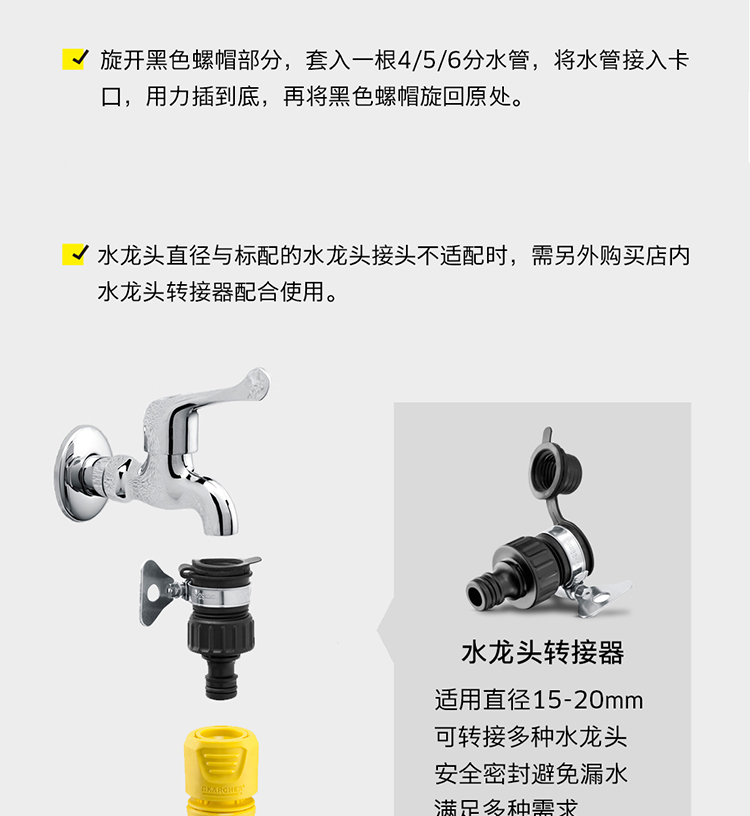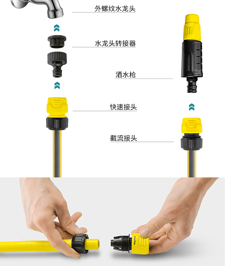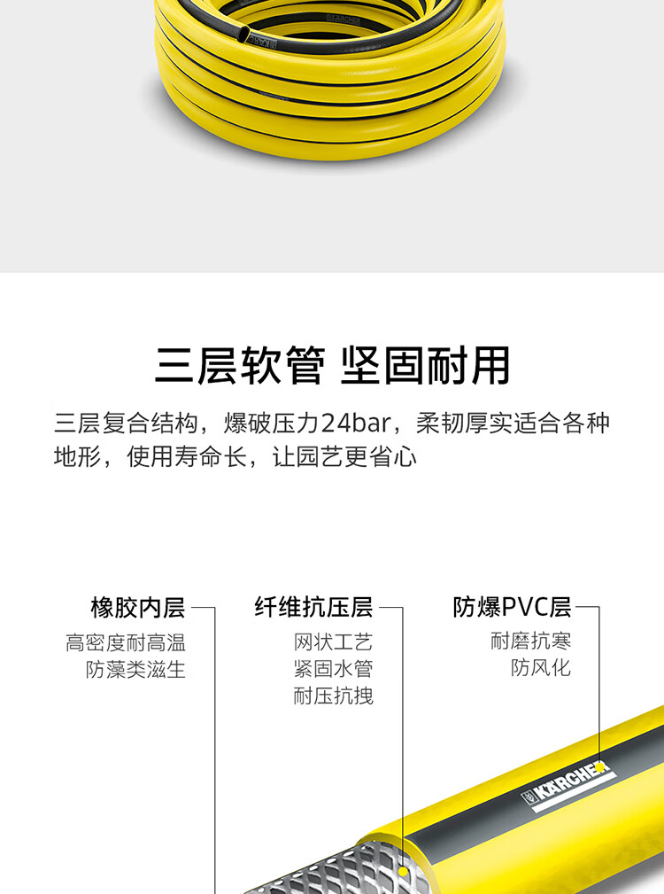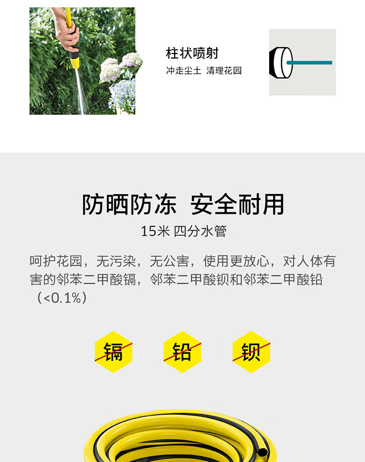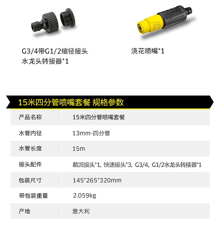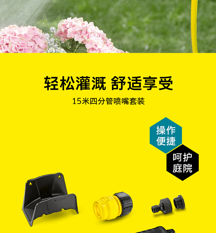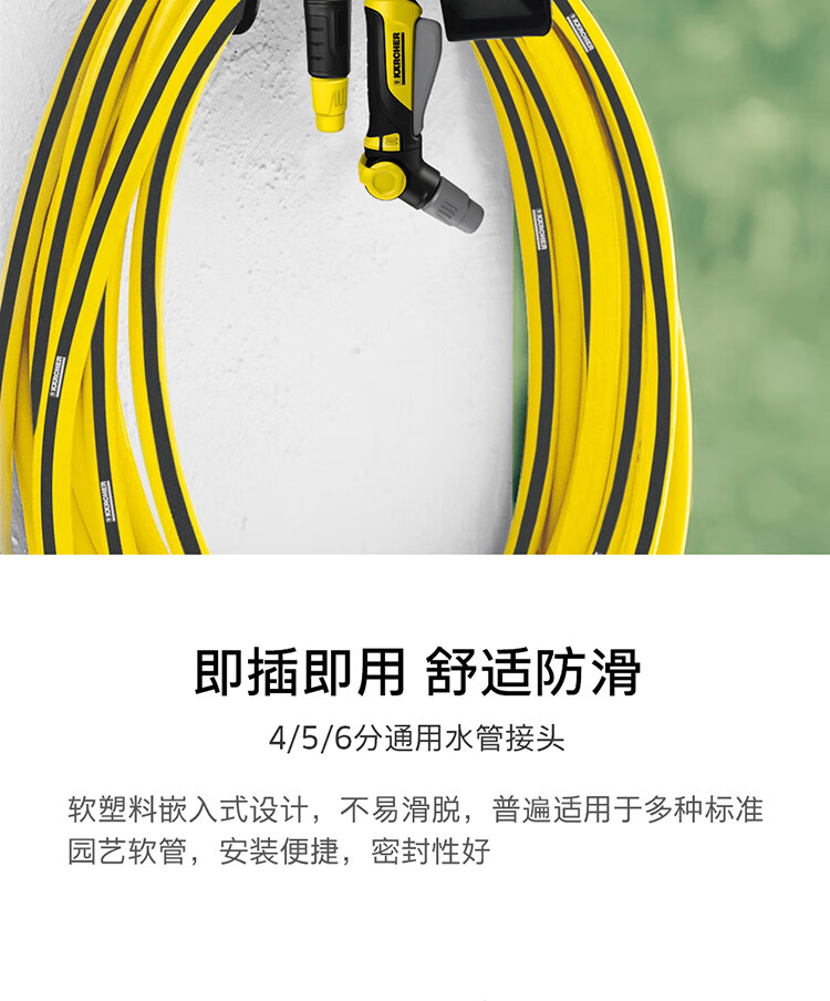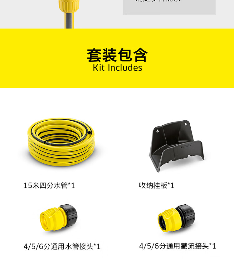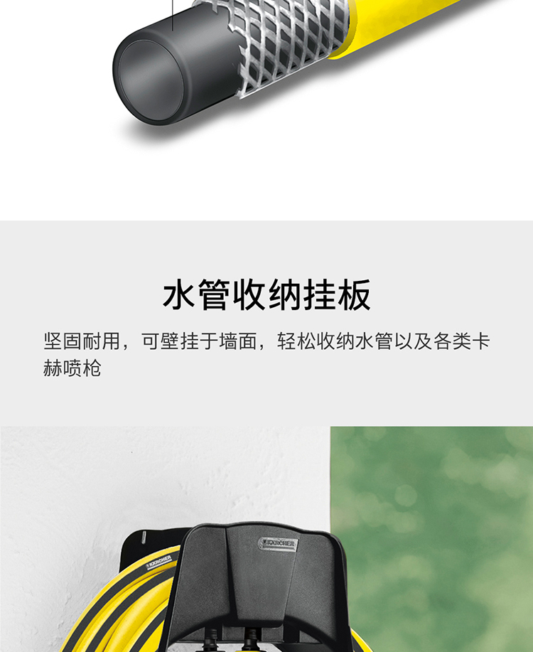 分类:水枪/水管/水管车;品牌:卡赫(KARCHER);包装清单:15米4分管*1 收纳挂板*1 4/5/6分通用水管接头*1 4/5/6分通用截流管接头*1 G3/4带G1/2缩径接头水龙头转接器*1 浇花喷嘴*1;