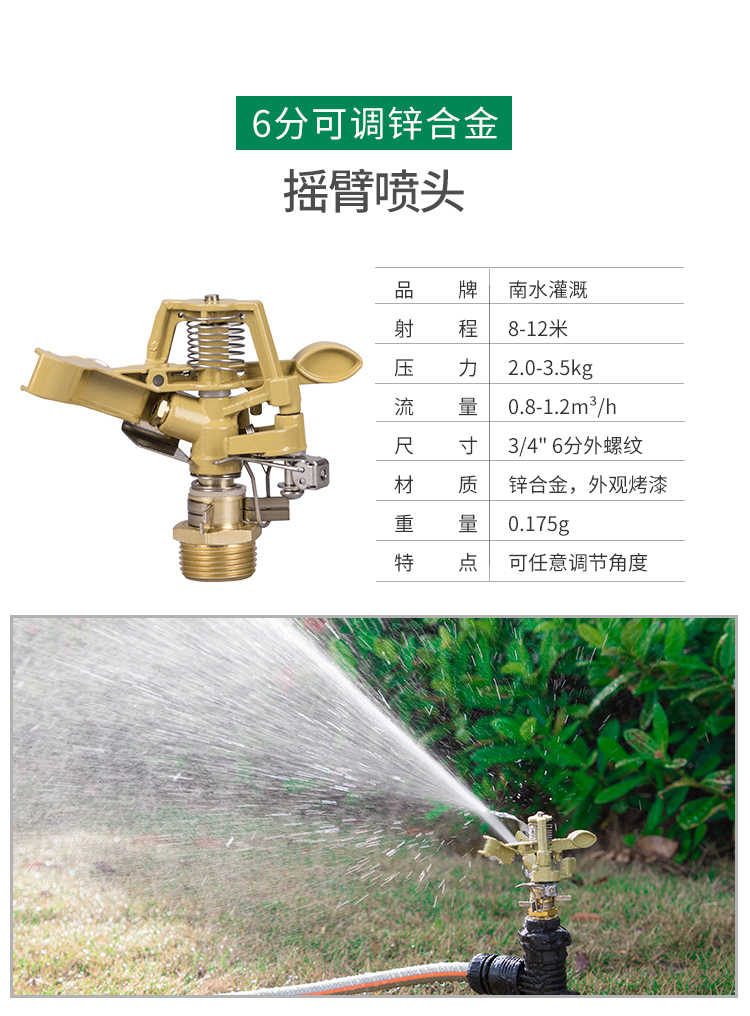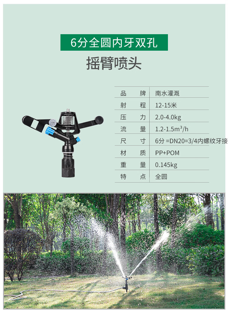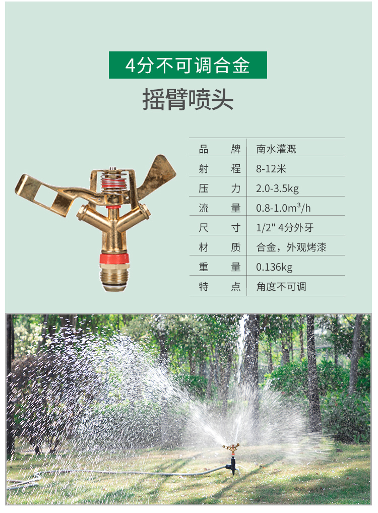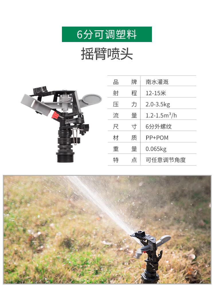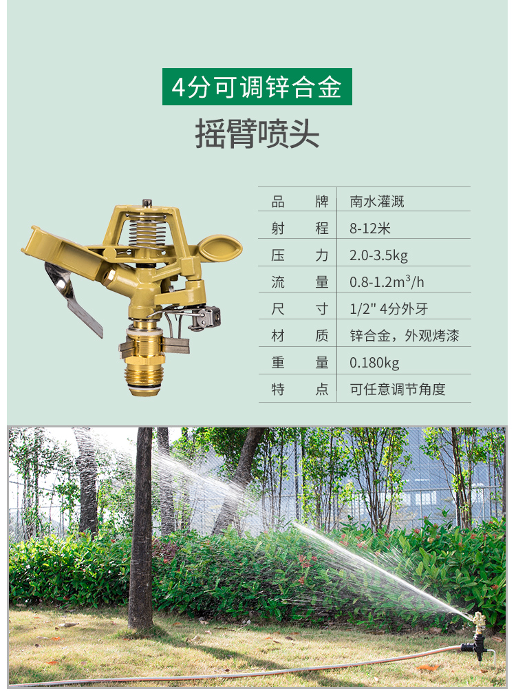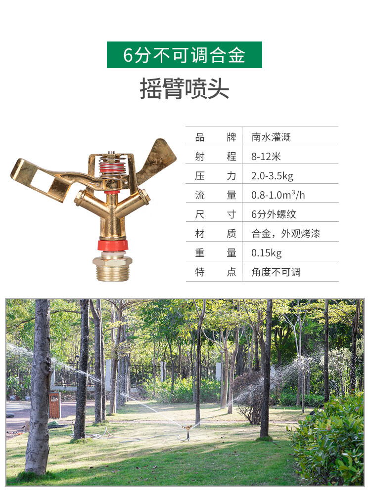 国产/进口:国产;分类:微喷;品牌:南水灌溉;包装清单:4分锌合金不可调角度摇臂喷头*2;