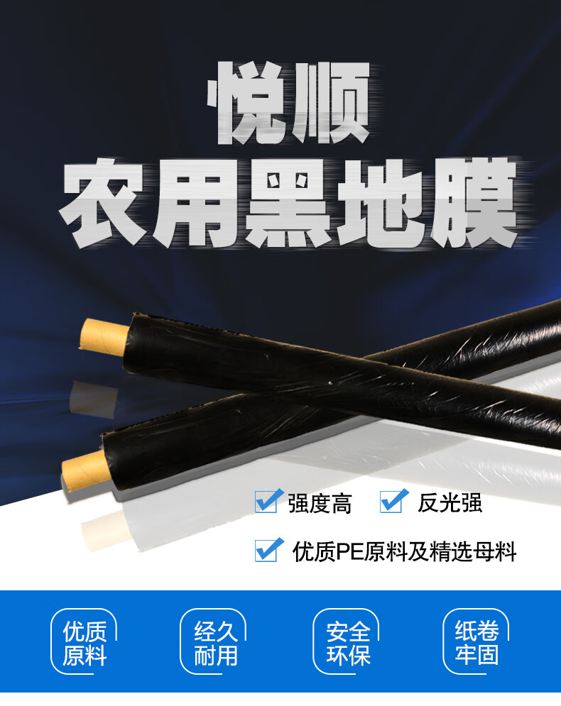 用途:地膜;性能:无滴薄膜;透光性:遮光薄膜;品牌:悦顺;包装清单:农用黑色地膜1.5米宽1丝厚约260米长净重8斤/卷;