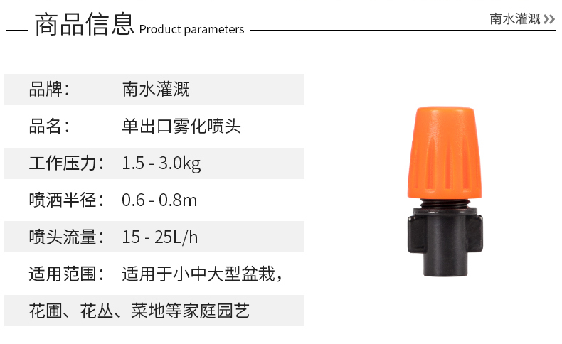材质:塑料;国产/进口:国产;分类:微喷;品牌:南水灌溉;包装清单:桔色雾化喷头10个;