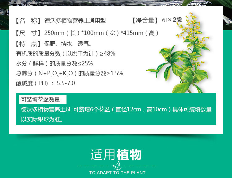 类型:泥炭;品牌:德沃多肥料;包装清单:德沃多有机营养土6L*2包;