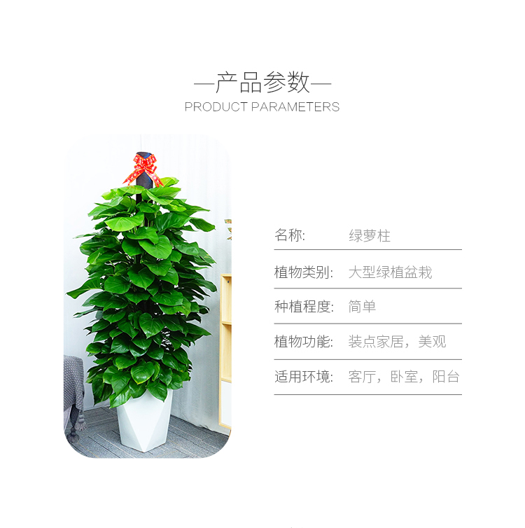 是否含花盆:含盆;适用空间:办公室,接待前台,书房,客厅;风格:简约风;植物品种:绿萝柱;整体高度:141cm-170cm;是否开花:否;品牌:种着玩;包装清单:配套托盘,瓷盆、水泥盆、塑料盆搭配塑料托盘,编织盆、布筒等搭配透明接水壳。;