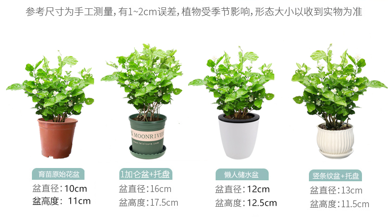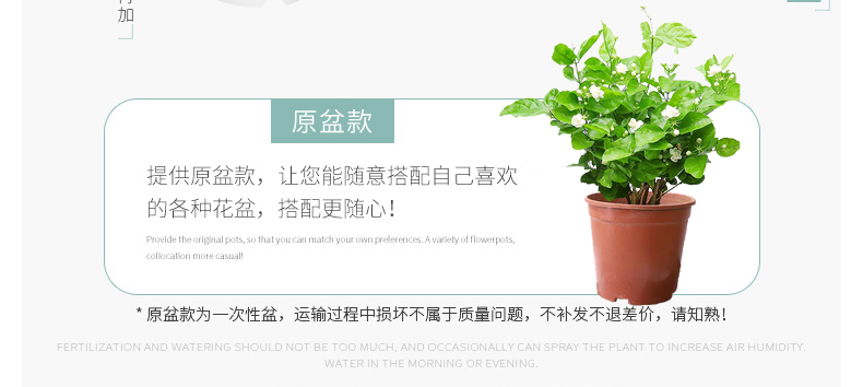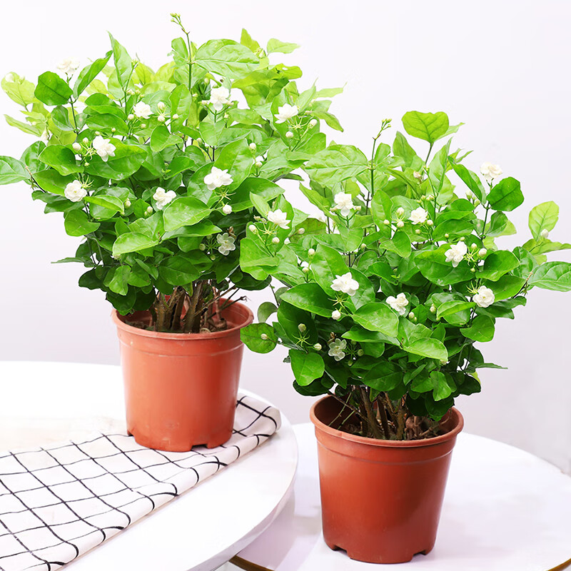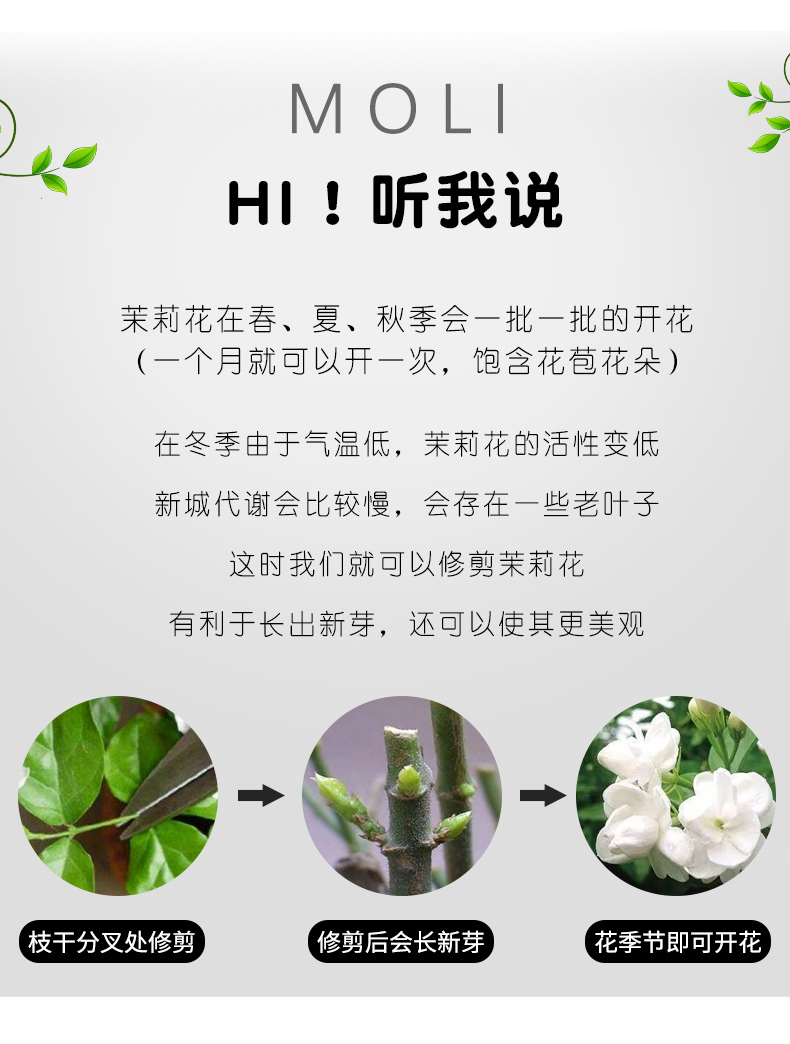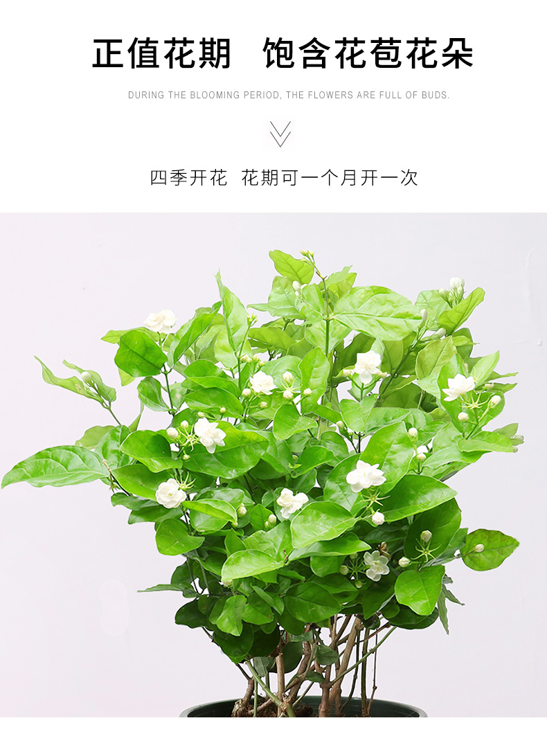 开花季节:长花期;植物品种:茉莉花;是否含花盆:不含盆;植物类别:木本花卉;适用空间:庭院,阳台,客厅;颜色:绿色;包装清单:白茉莉-简易盆;