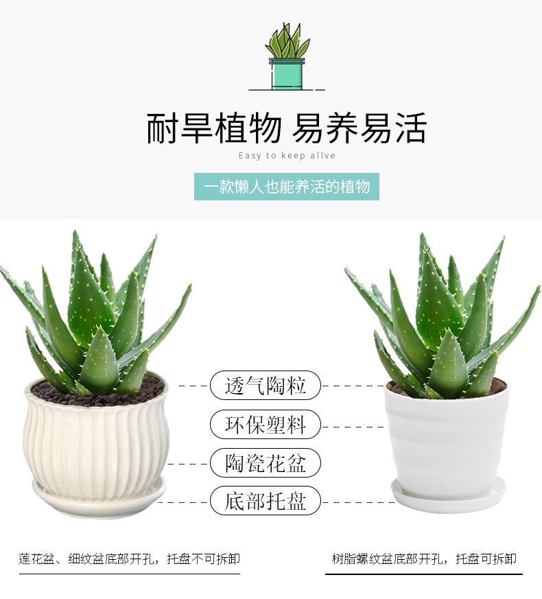 植物品种:芦荟;是否含花盆:含盆;植物类别:观叶植物;适用空间:庭院,阳台,办公桌,书房;包装清单:花草陶瓷盆-芦荟;